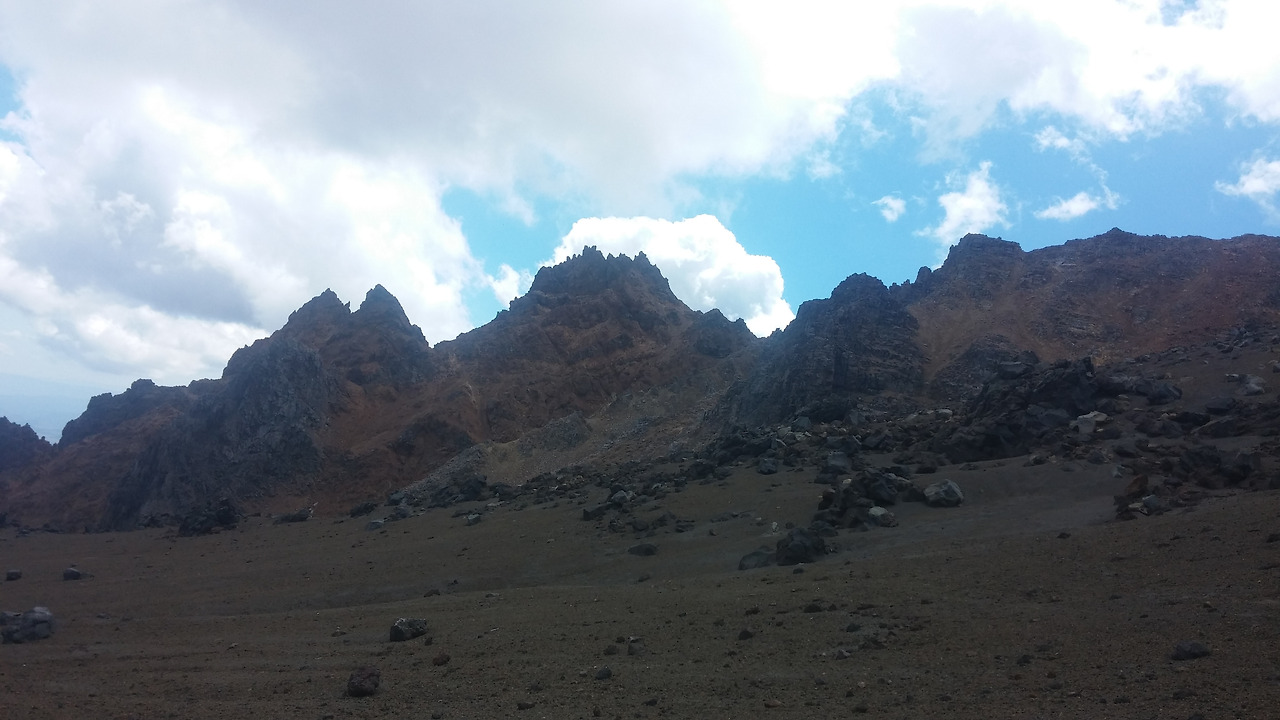 오호 놀라워라. 스카이라인에 올라섰을 때의 그 기분은 뭐라 형용하기 어렵다. 이 산을 오르지 않았으면 얼마나 아쉬웠을까. 후회했을까. 정상은 설산이고 그리고 바로 왼쪽에는 원추형의 잘 생긴 그 나우루호에 산이 떡허니 솟아있다..... 이런 광경을 어디서 볼 수 있을까. 화산 등산은 처음이다. 푸른 산의 아름다움이 아닌, 신비롭고 담백한 느낌과 척박한 느낌이 오히려 힘을 느끼게 하는 산이다.