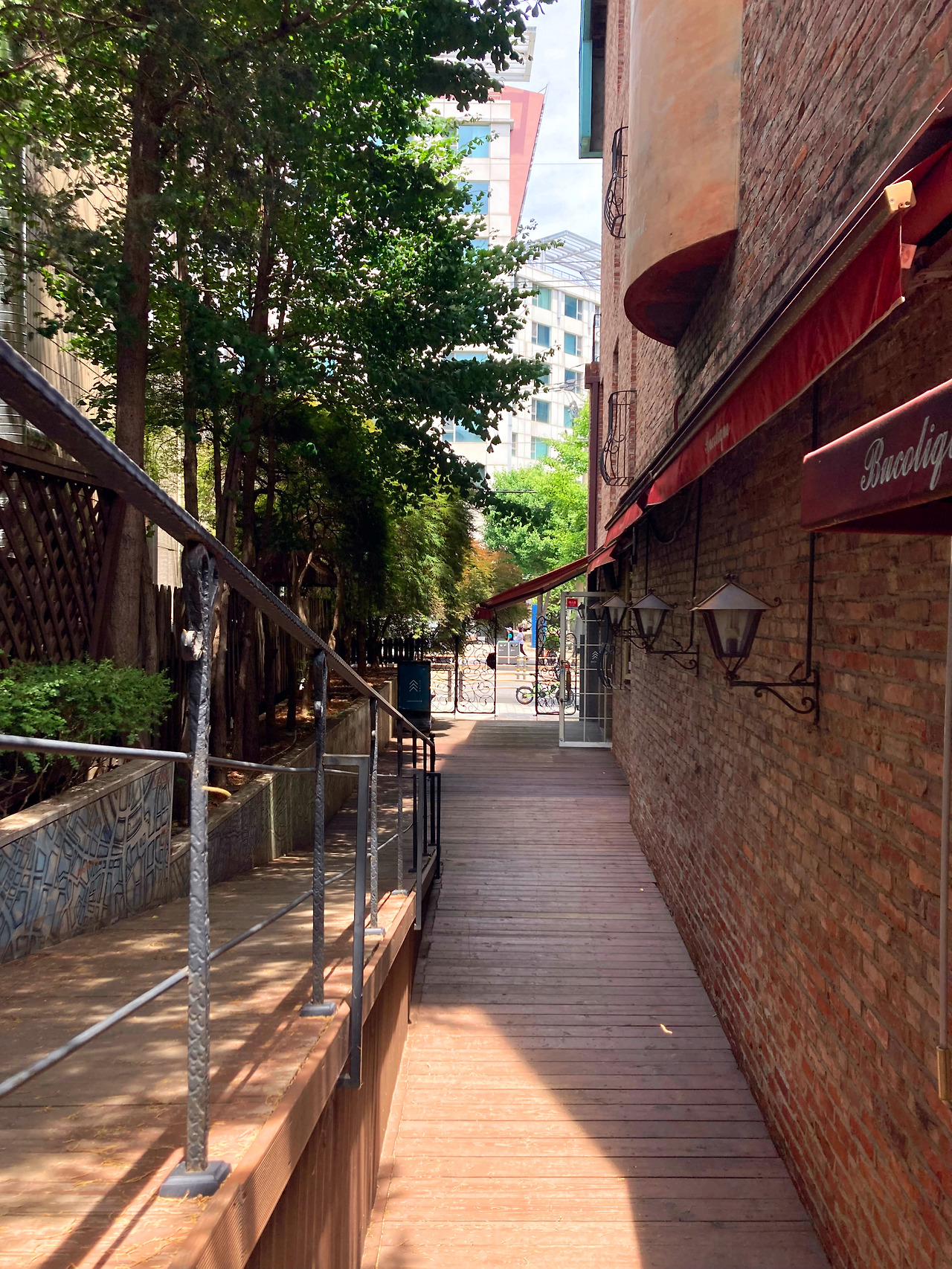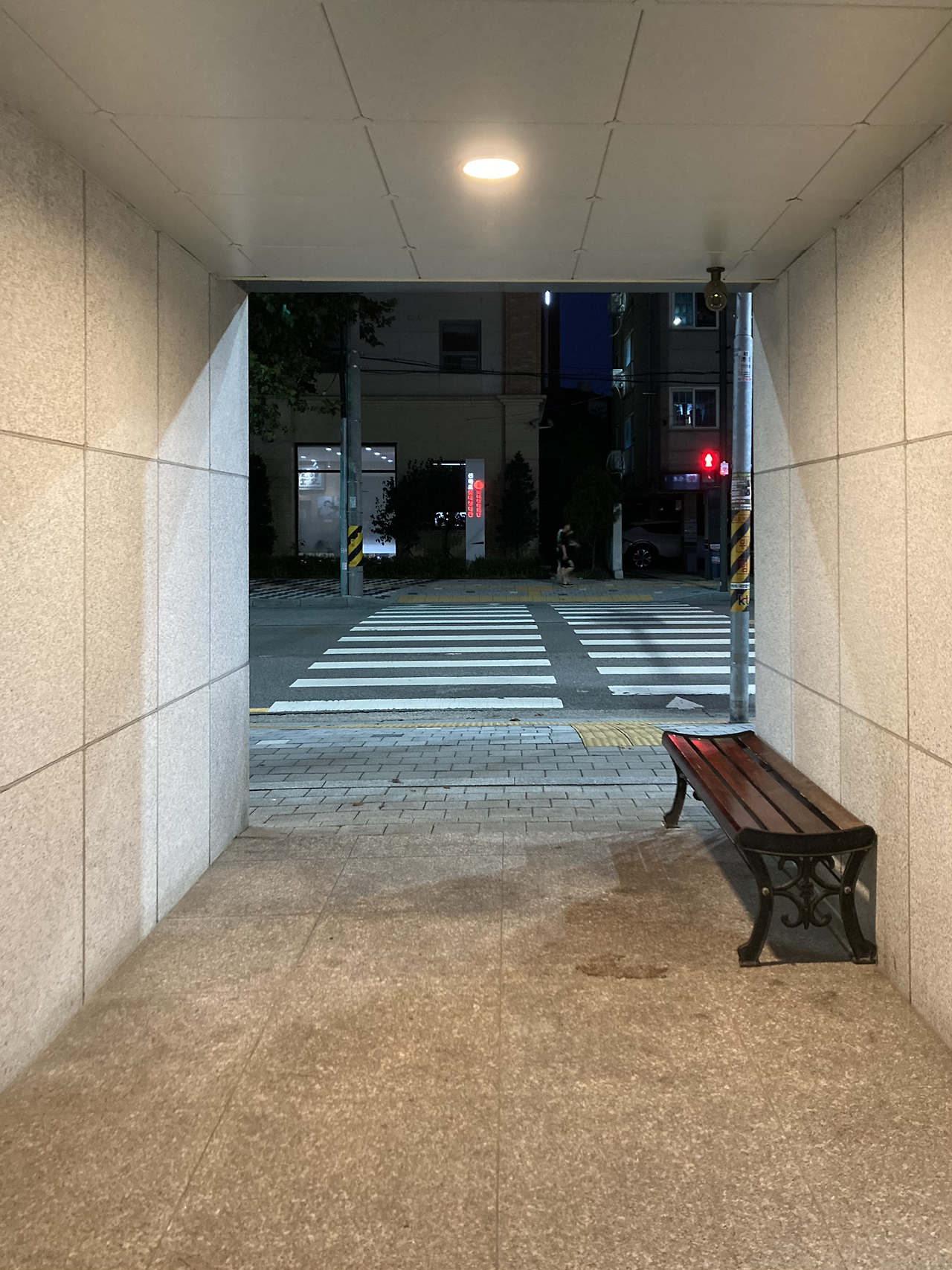 벤치가 없었다면, 관계자가 아니고서는 저 안에 들어갈 생각을 못하겠죠. 바깥에 가까워질 수록 '나도 한 번 앉아볼까?'라는 생각을 하기가 쉬워집니다. 만약 벤치가 ㄱ자 모양으로 바깥까지 이어져 있다면 더 접근하기 쉽지 않을까요?