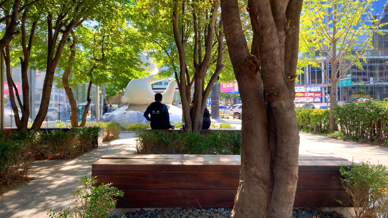 정적인 순간 중에서 휴식, 특히 노동자의 휴게공간은 어떨까요? 제가 알바를 했던 건물은 복도와 계단실 사이에 부속실이라는 공간이 있었습니다. 그리고 충격적인 사실을 알게 됐습니다. 그곳은 휴게공간이 따로 없던 청소노동자분이 앉을 수 있는 유일한 곳이었던 겁니다. 환기도 되지 않는 1평 남짓한 공간, 파란 원통형 쓰레기통, 그 옆에 앉아 있는 사람.