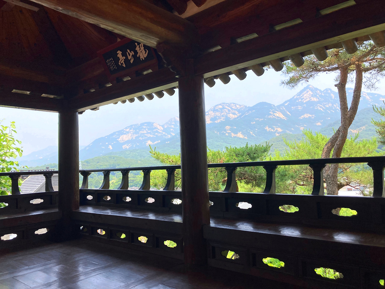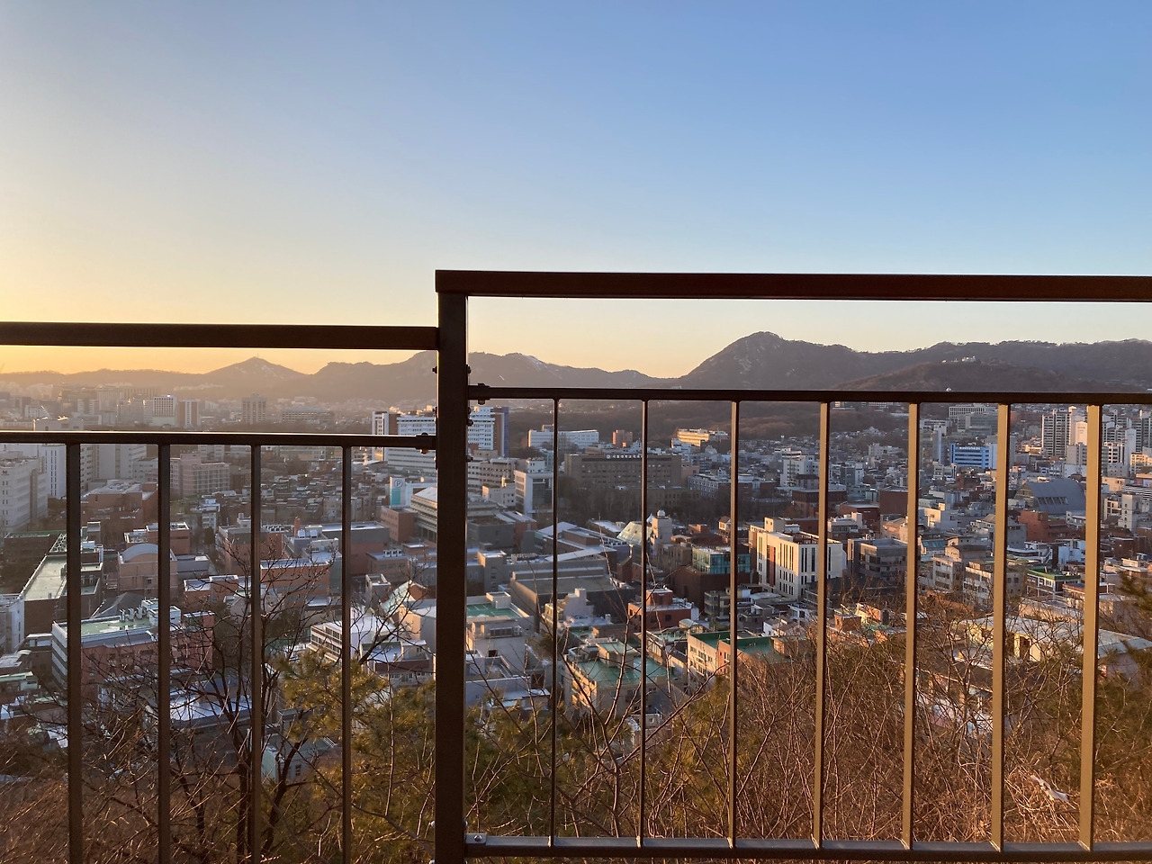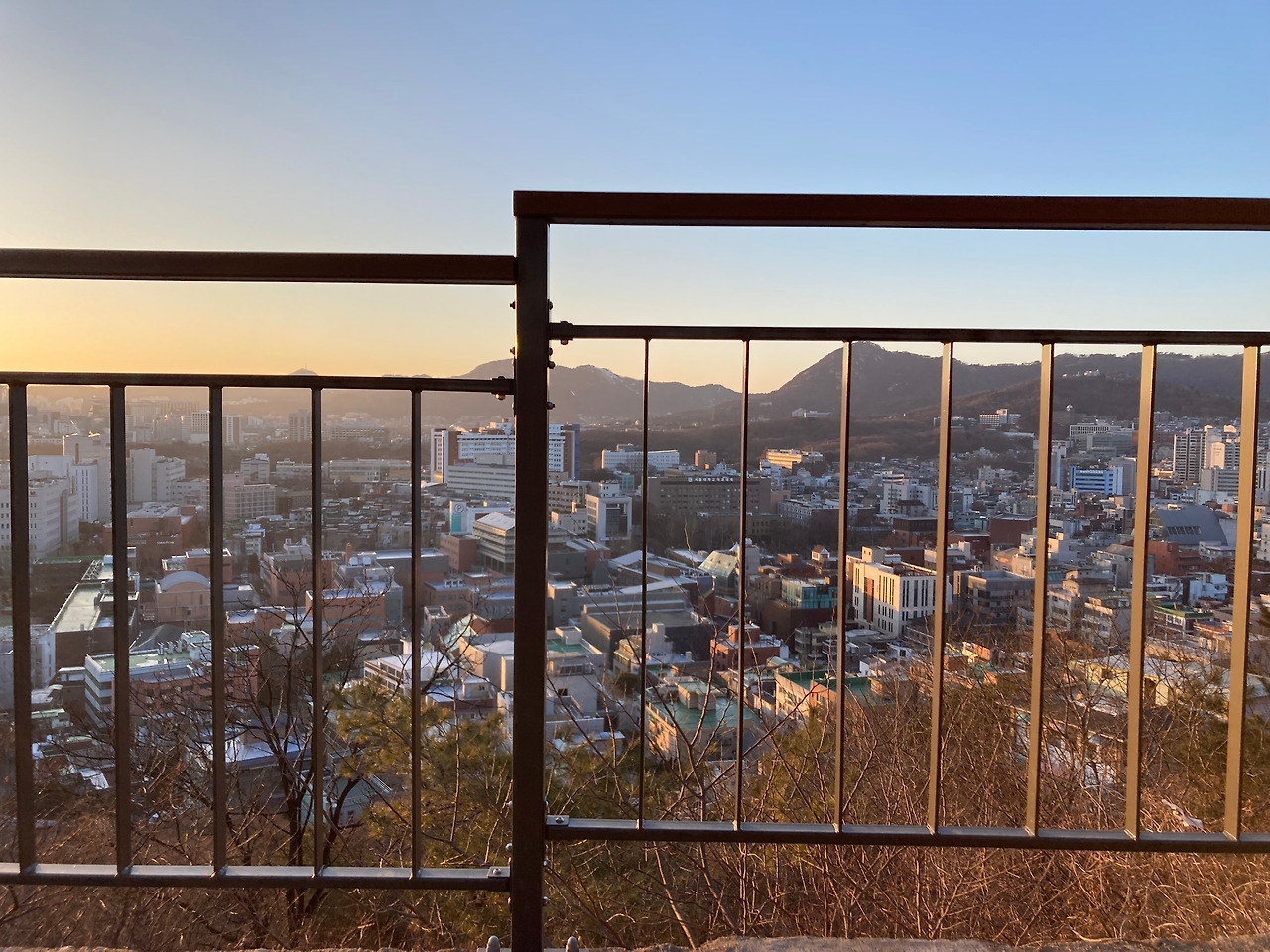 난간 틈이 액자가 됩니다. 액자 안에 사로잡힌 그림은 내 시선에 따라 달라집니다. 창살로 가둔 것 같은 영역이 그림이 되고(왼쪽 사진), 가로로 얇게 펴진 틈에 들어간 산이 그림이 되고(가운데 사진), 산 위로 뻗은 하늘이 그림이 됩니다(오른쪽 사진).