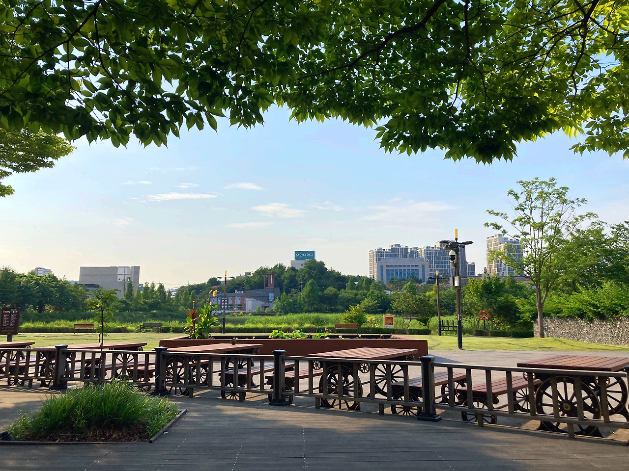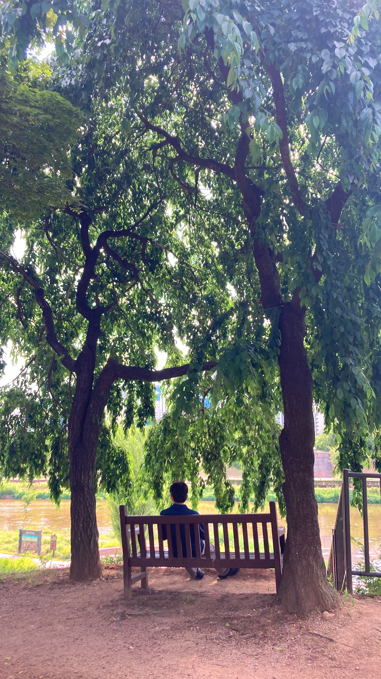 개천이 보이는 좁은 길 위 벤치에는 나뭇잎이 커튼처럼 내려와 있습니다. 이 일대가 사뭇 다르게 느껴집니다.
