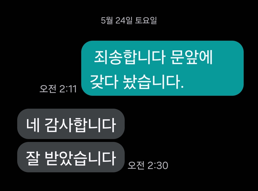 “죄송합니다. 문 앞에 갖다 놨습니다.”