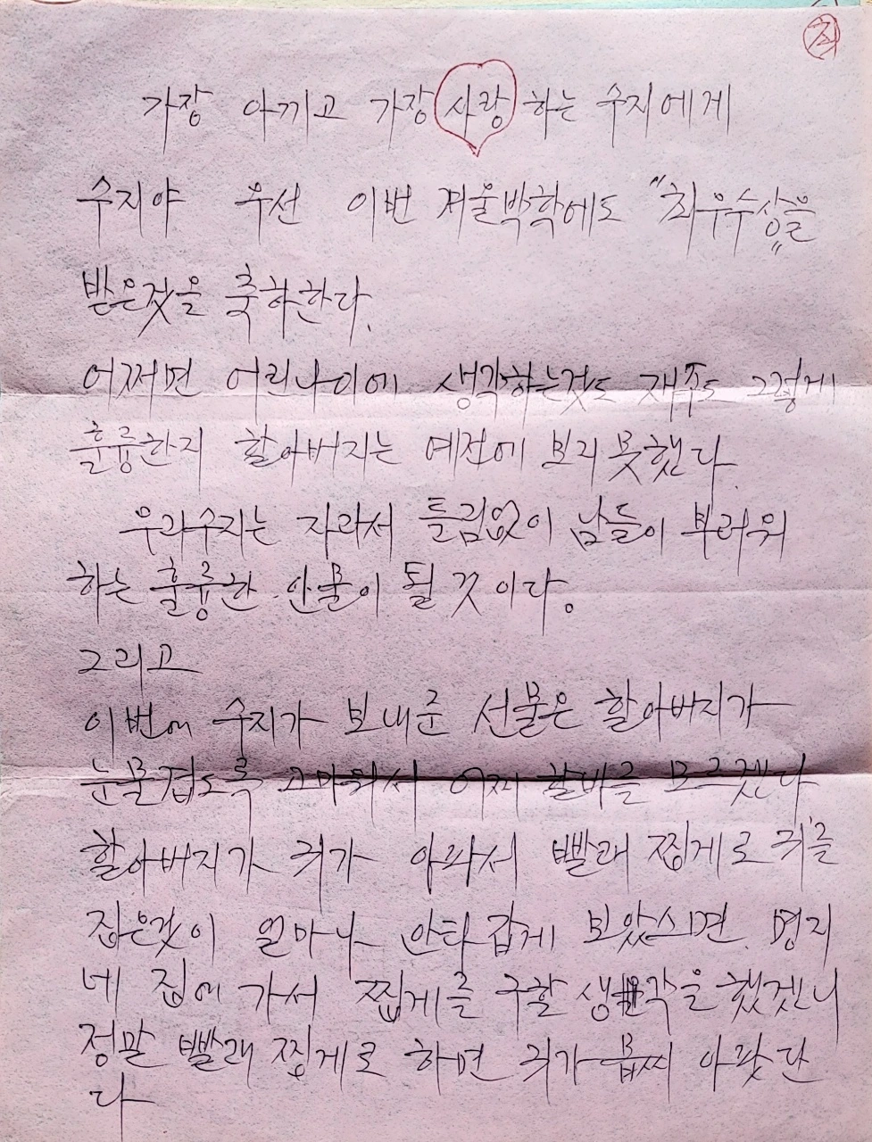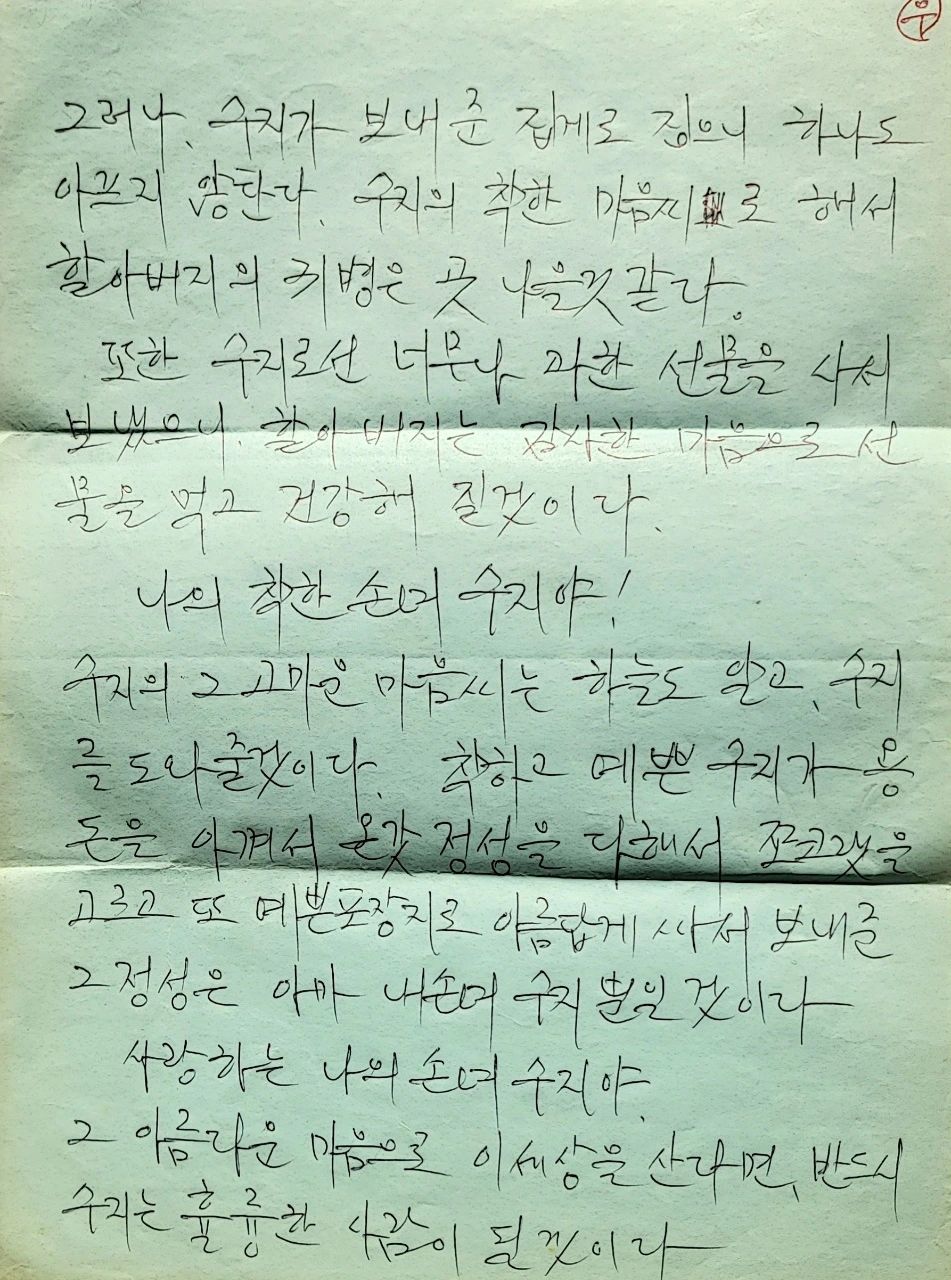 수지야 우선 이번 겨울방학에도 최우수상을 받은 것을 축하한다. 어쩌면 어린아이에 생각하는 것도 재주도 그렇게 훌륭한지 할아버지는 예전에 보지 못했다. 우리 수지는 자라서 틀림없이 남들이 부러워하는 훌륭한 인물이 될 것이다. 그리고 이번에 수지가 보내준 선물은 할아버지가 눈물겹도록 고마워서 어찌 할 바를 모르겠다. 할아버지가 귀가 아파서 빨래 찝게로 귀를 집은 것이 얼마나 안타깝게 보았스면. 명지네 집에 가서 찝게를 구할 생각을 했겠니. 정말 빨래 찝게로 하면 귀가 몹씨 아팟단다.