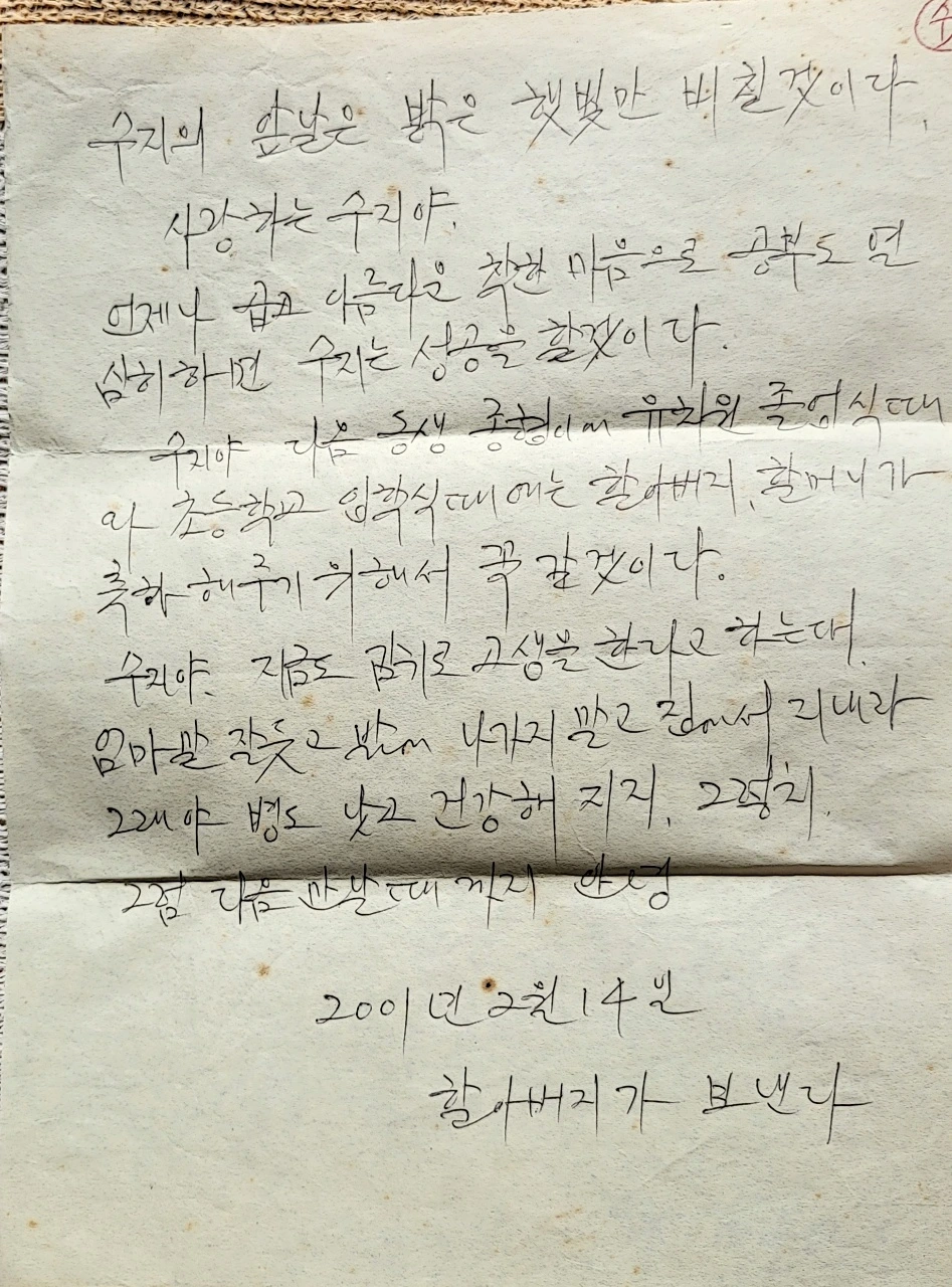 사랑하는 수지야. 언제나 곱고 아름다운 착한 마음으로 공부도 열심히 하면 수지는 성공을 할 것이다. 수지야 다음 동생 종협이의 유치원 졸업식 때와 초등학교 입학식 때에는 할아버지, 할머니가 축하해주기 위해서 꼭 갈 것이다. 수지야. 지금도 감기로 고생을 한다고 하는데, 엄마 말 잘듯고 밖에 나가지 말고 집에서 지내라. 그래야 병도 낫고 건강해지지. 그렇지. 그럼 다음 만날 때까지 안녕