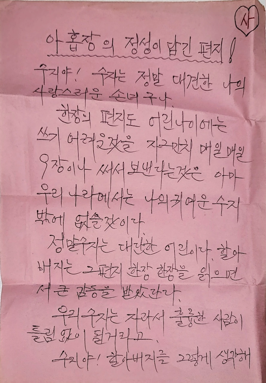 수지야! 수지는 정말 대견한 나의 사랑스러운 손녀구나. 한 장의 편지도 어린 나이에는 쓰기 어려운 것을 자그마치 매일매일 9장이나 서서 보낸다는 것은 아마 우리나라에서 나의 귀여운 수지밖에 없을 것이다. 정말 수지는 대단한 어린이다. 할아버지는 그 편지 한 장 한 장을 읽으면서 큰 감동을 받았단다. 우리 수지는 자라서 훌륭한 사람이 틀림없이 될 거라고. 수지야! 할아버지를 그렇게 생각해주니 정말 고맙다.