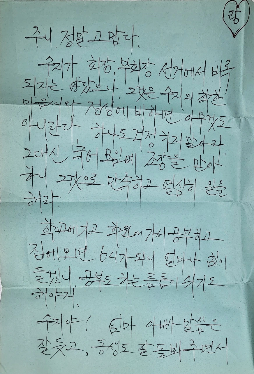 수지가 회장, 부회장 선거에서 비록 되지는 않았으나. 그것은 수지의 착한 마음씨와 정성에 비하면 아무것도 아니란다. 하나도 걱정하지 말아라. 그 대신 국어 모임에 조장을 맡아하니 그것으로 만족하고 열심히 일을 해라. 학교에 가고 학원에 가서 공부하고 집에 오면 6시가 되니 얼마나 힘이 들겠니. 공부도 하는 틈틈이 쉬기도 해야지.