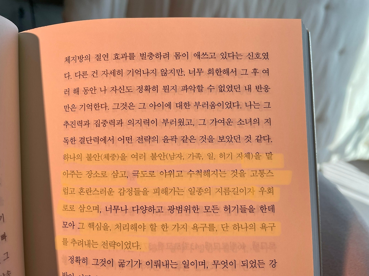 냅은 오랜 시간 거식증을 앓았고, 자신이 굶는 욕구 아래 자리 잡은 욕구들을 풀어내어 글로 적은 것이 이 책이었다. 방대한 내용을 함축할 수는 없겠지만, 냅의 욕구는 엄마에게서 투사되어 온 불안, 부담감, 자신의 존재다운 것을 찾지 못한 혼란스러움 등으로 빚어졌다. 혼란스러움 속에서 지름길처럼 찾은 것이 ‘사회에서 이렇다고 말하는 모습’에 자신이 퍼즐 조각처럼 맞춰질 때였고, 체중이 적게 나가는 모습이었다. 그렇게 굶기의 희열을 느끼게 되면서 거식증을 투병하게 됐다.