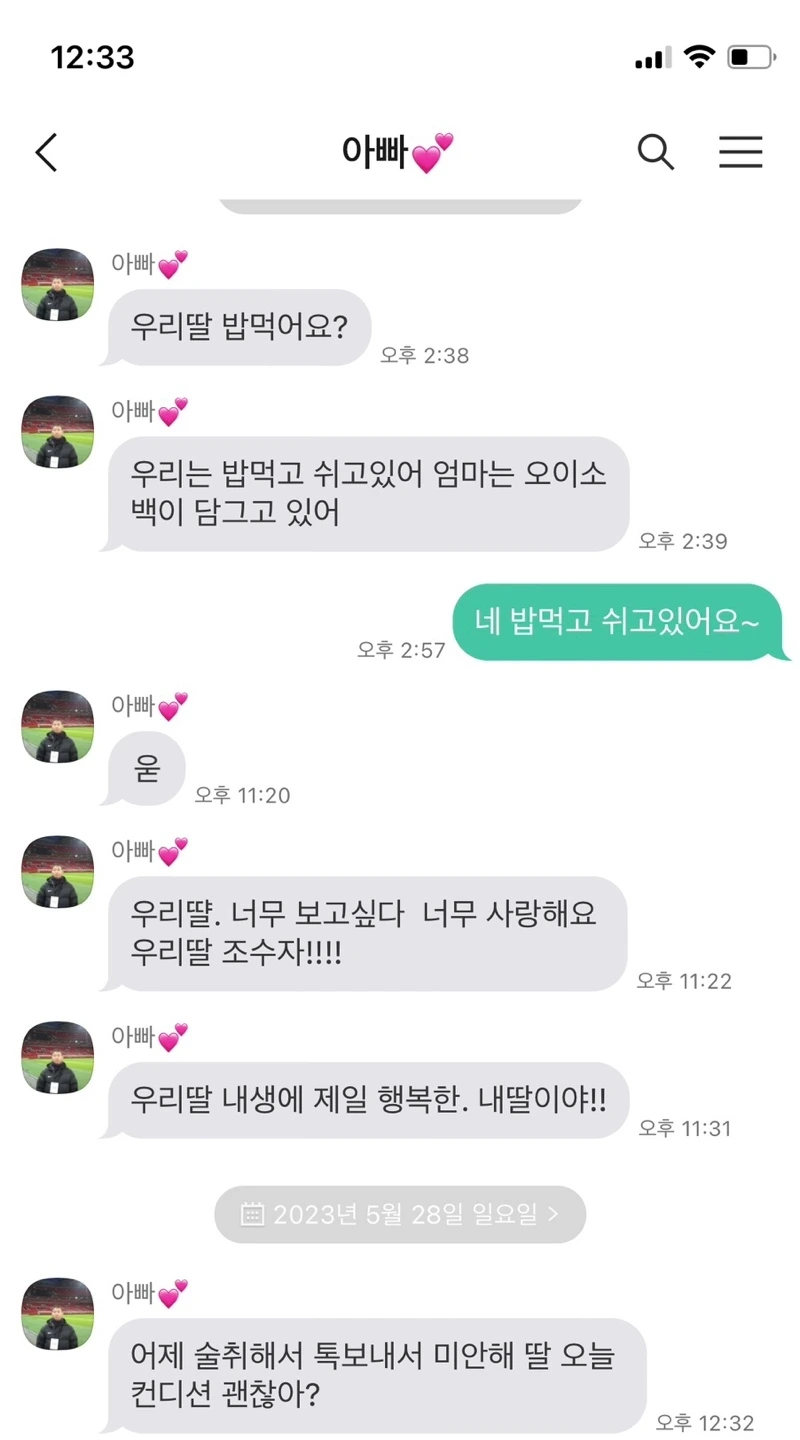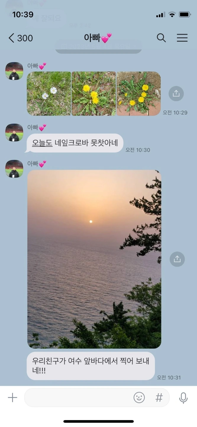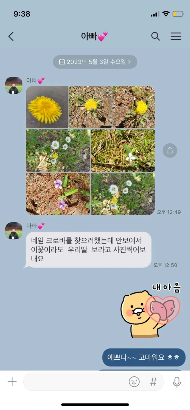 입덧이 가장 심했을 때 전화로 자기가 지금 먹은 식사메뉴를 자랑할 만큼 철도 없고 눈치도 없는 아빠였지만, 자식에 대한 애정만큼은 막무가내 수준이었다. 기어코 찾은 네 잎 클로버는 코팅을 해서 전해주었고, 술을 먹으면 보고 싶다고 전화오기 일쑤 그마저도 나중에는 눈치를 보는지 카톡이 왔다.