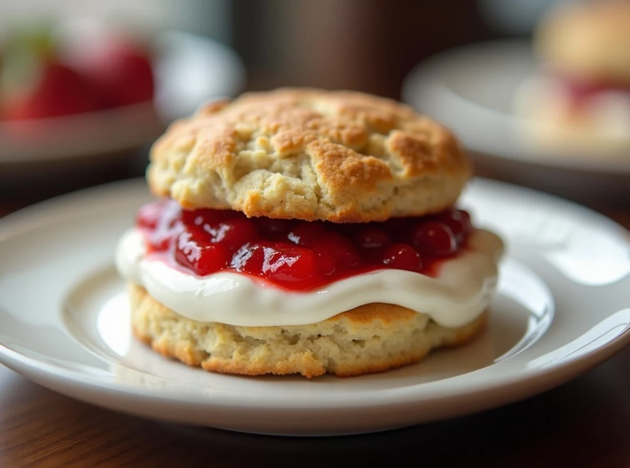 스콘 위에 잼을 올리고, 그 위에 클로티드 크림을 듬뿍 얹었어요.