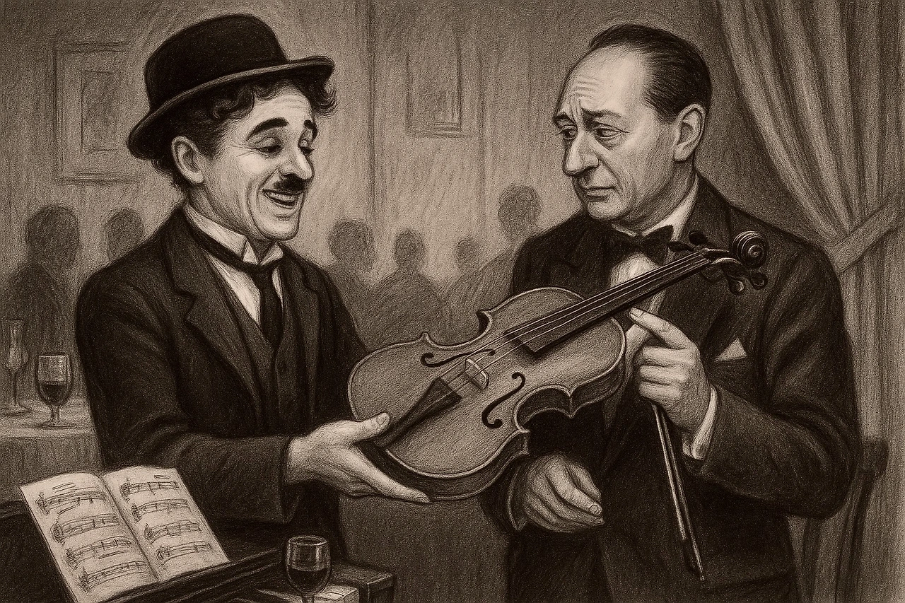 채플린의 악기를집어 들었다가 연주가 되지 않자,