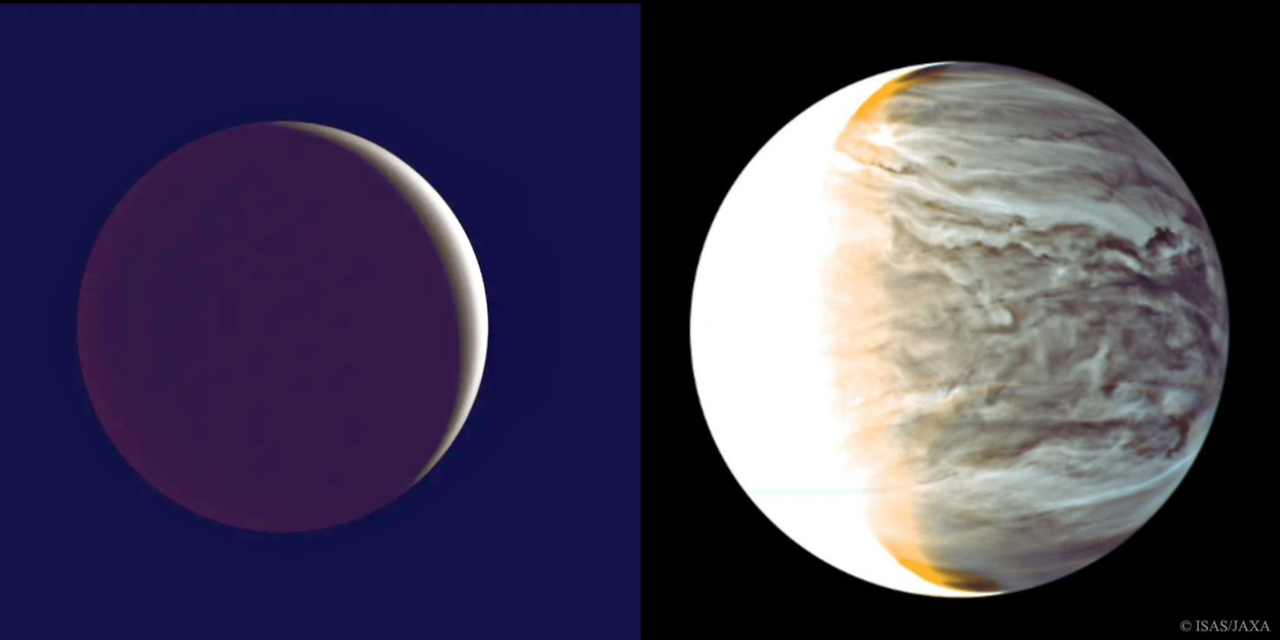 오른쪽 : 우주 탐사선이 포착한 금성의 두꺼운 대기,