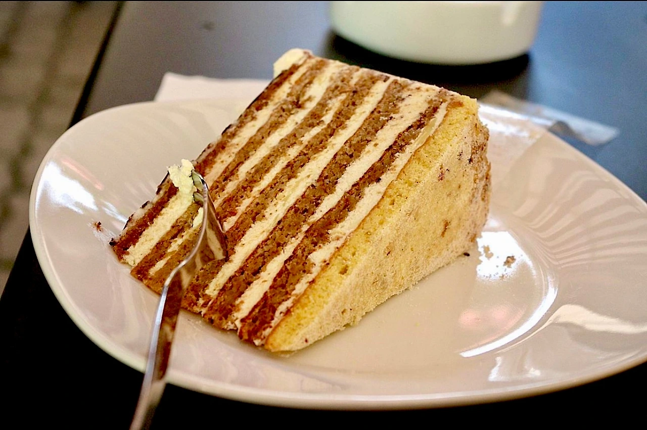 화려한 레이어 속에 호두와 크림을 층층이 쌓아 올린 디저트