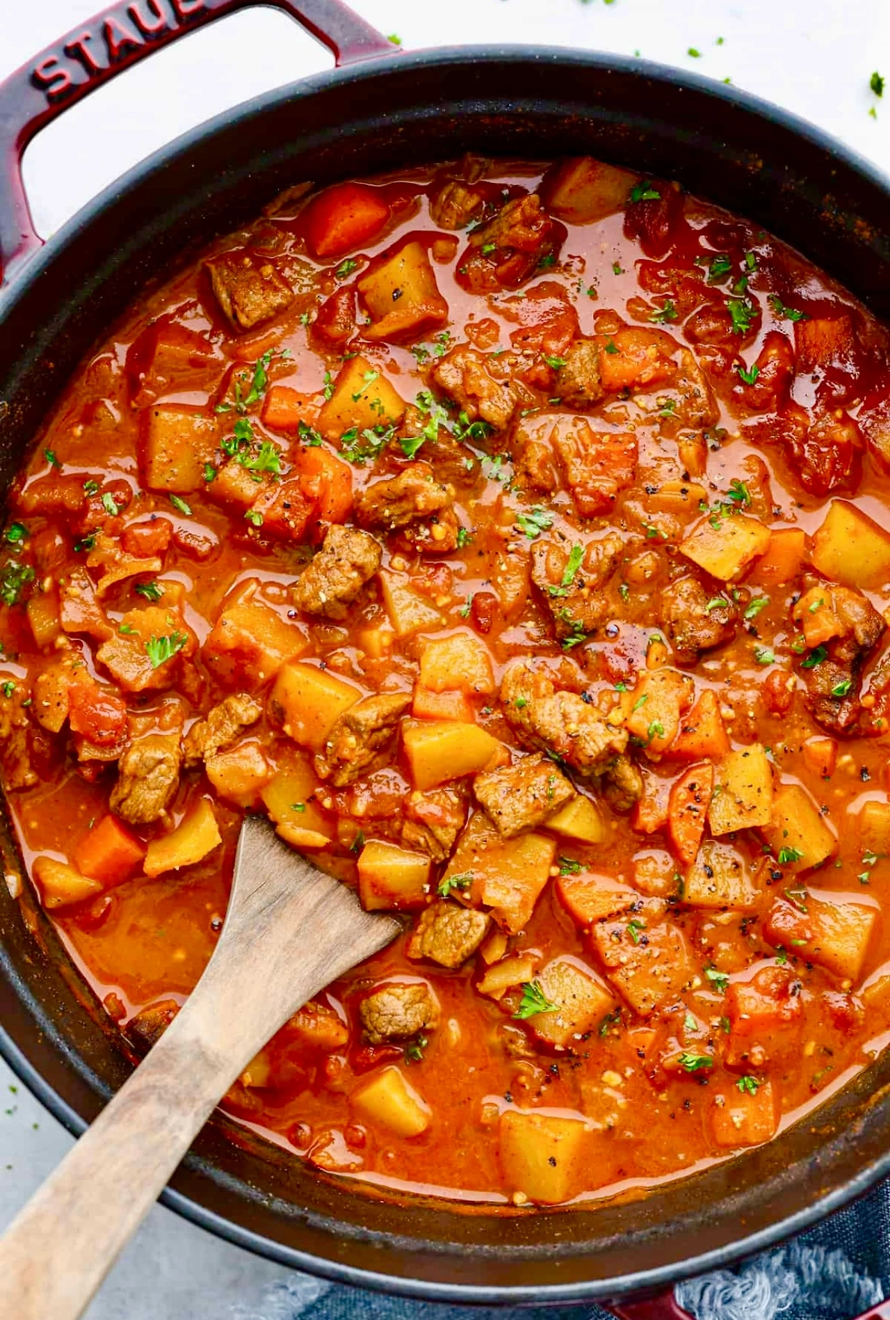 커다란 솥에 양파와 고기, 감자, 그리고 파프리카를