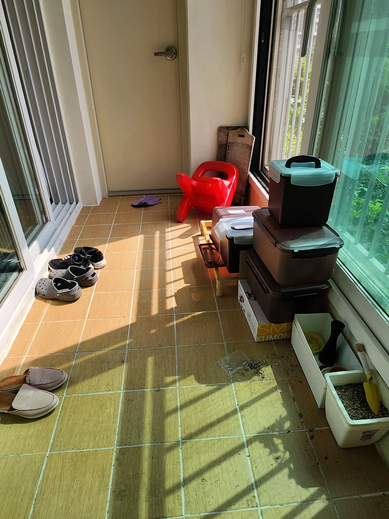 생각해 보면 베란다에 물건들이 있어서 불편한 점은 한두 가지가 아니었다. 강아지들이 베란다에 나갈 때마다 슬리퍼를 물고 들어왔고, 한 번은 다육이를 죄다 물고 들어와서 침대 위에서 질겅질겅 씹어대는 통에 안방 바닥이며 침대며 한바탕 흙난리가 난 적도 있다(그 이후 식물은 모두 뽑아서 버림). 웬만하면 안방 쪽 창문을 꽁꽁 닫고 지내면서 환기할 때만 강아지들을 쫓아내고 창문을 개방했다.