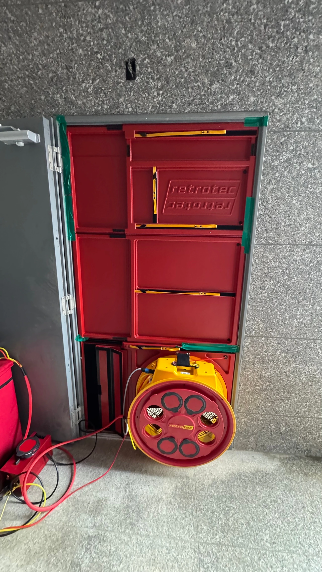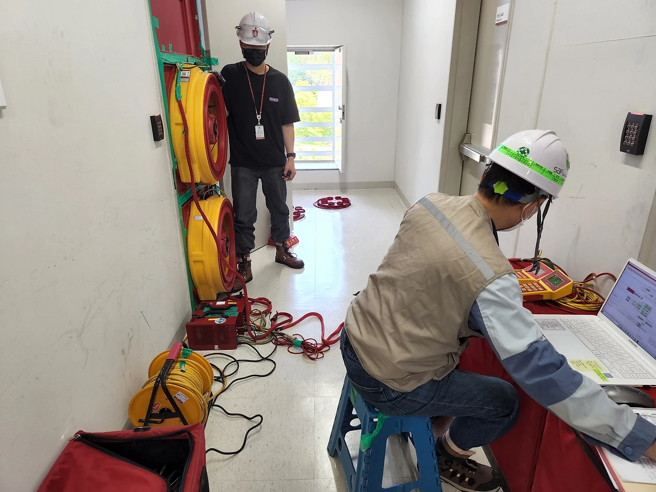 문풍기와 차압계를 이용해 공간의 누설률을 측정하고, 실제로 약제가 몇 분간 유지될지를 수치로 예측한다.