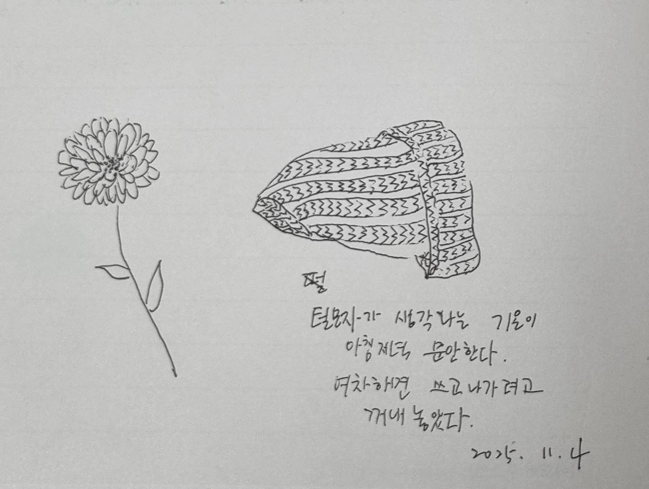 11월, 빵모자를 꺼내놓았다. 아직 머리가 시린 기온은 아니지만 추위에 약한 내겐 안전장치와도 같다. 지난 겨울은 벽돌색 모자를 주로 썼는데 나도 모르는 사이에 검정색이 사라졌다. 검정색을 좋아하지 않다보니 유야무야 소홀히 한 탓일 게다. 어디에서 잃어버렸는지 아는 게 이상하지 싶어 찾으려는 생각도 접었다.