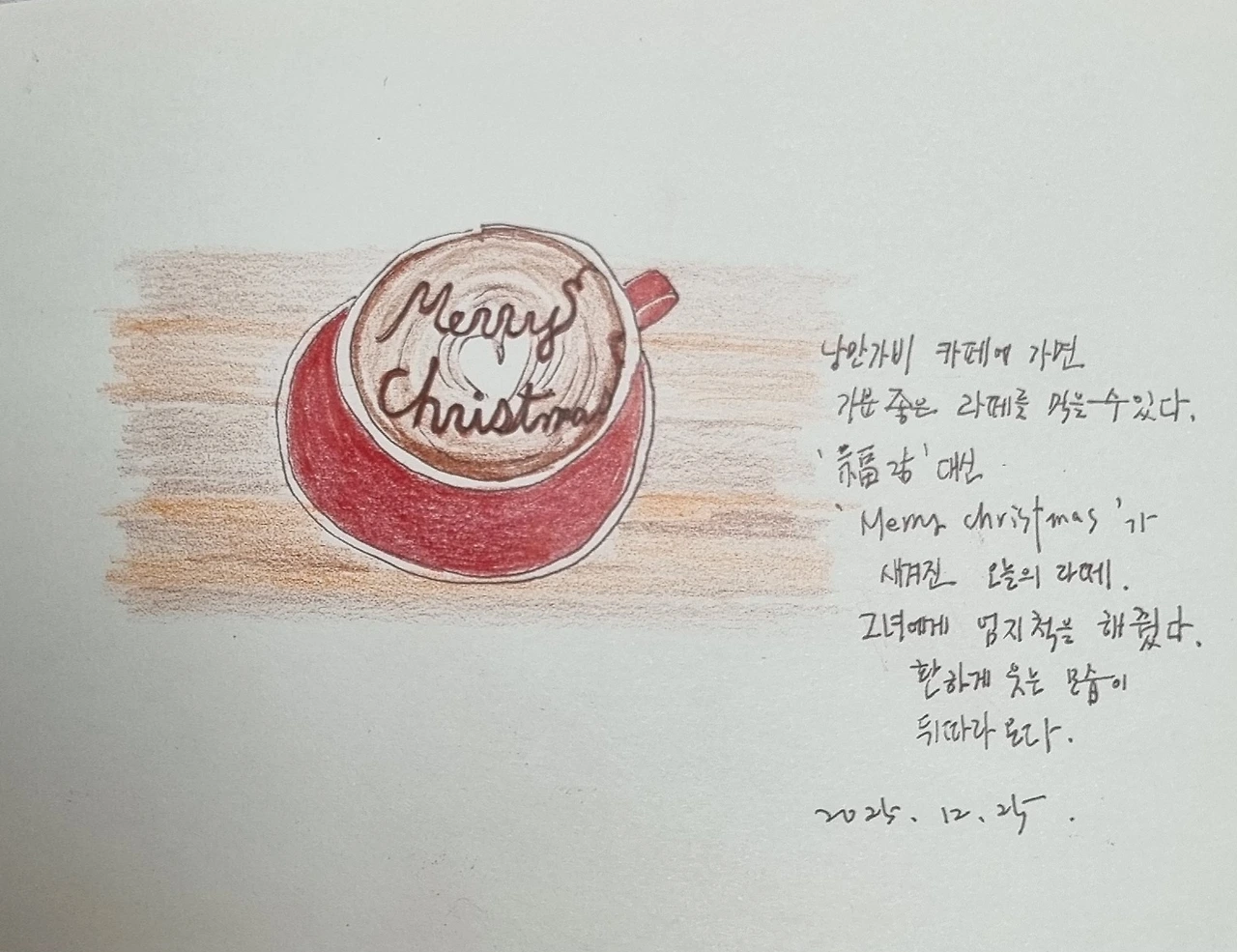 저녁에 그림일기를 썼다. 오늘의 하이라이트는 단연코 메리크리스마스 라떼다. 펜으로 드로잉하고 색연필을 사용했다. 그림은 실재와 다르지만 기억을 저장하는 데는 모자라지 않다. 오늘 함께한 지인들과 카페 사장님의 미소까지 줄줄이 따라온다.