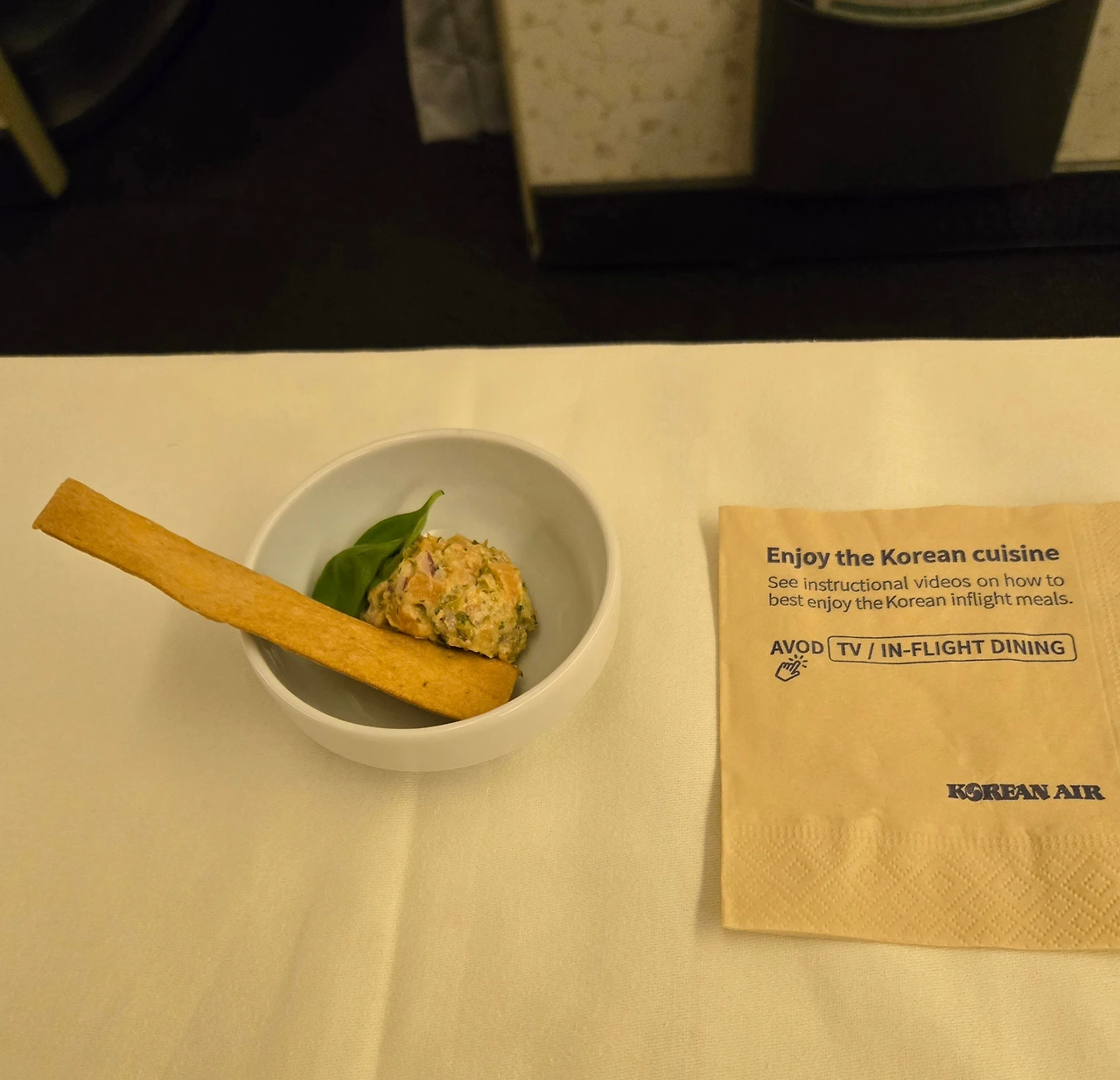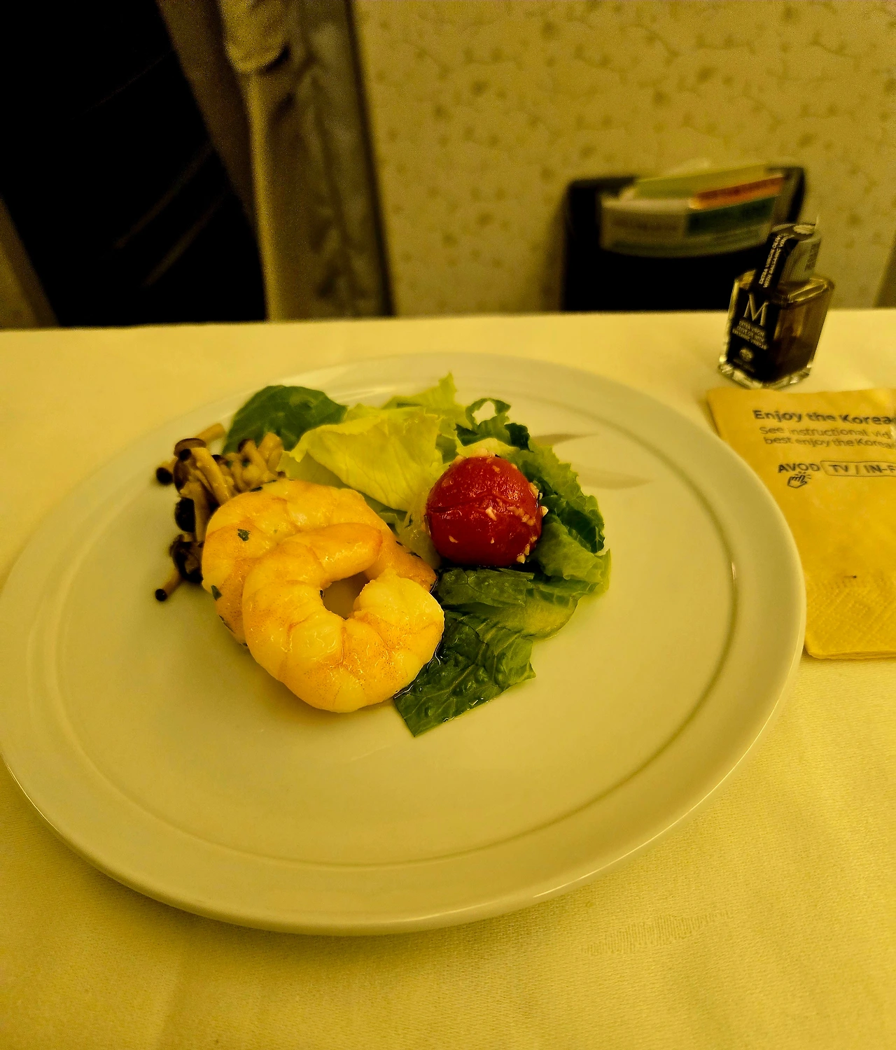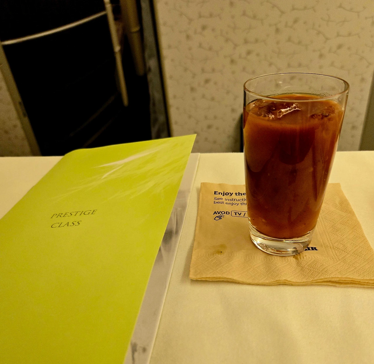기내에 들어서니 항상 economy만 타던 때와 확연히 비교된다. 출발하기 전인데도 테이블에 테이블보를 깔아주며 웰컴 드링크를 준다. 대접받고 있다는 느낌이 들 정도로 예쁜 승무원들이 활짝 웃으며 서빙을 해준다.
