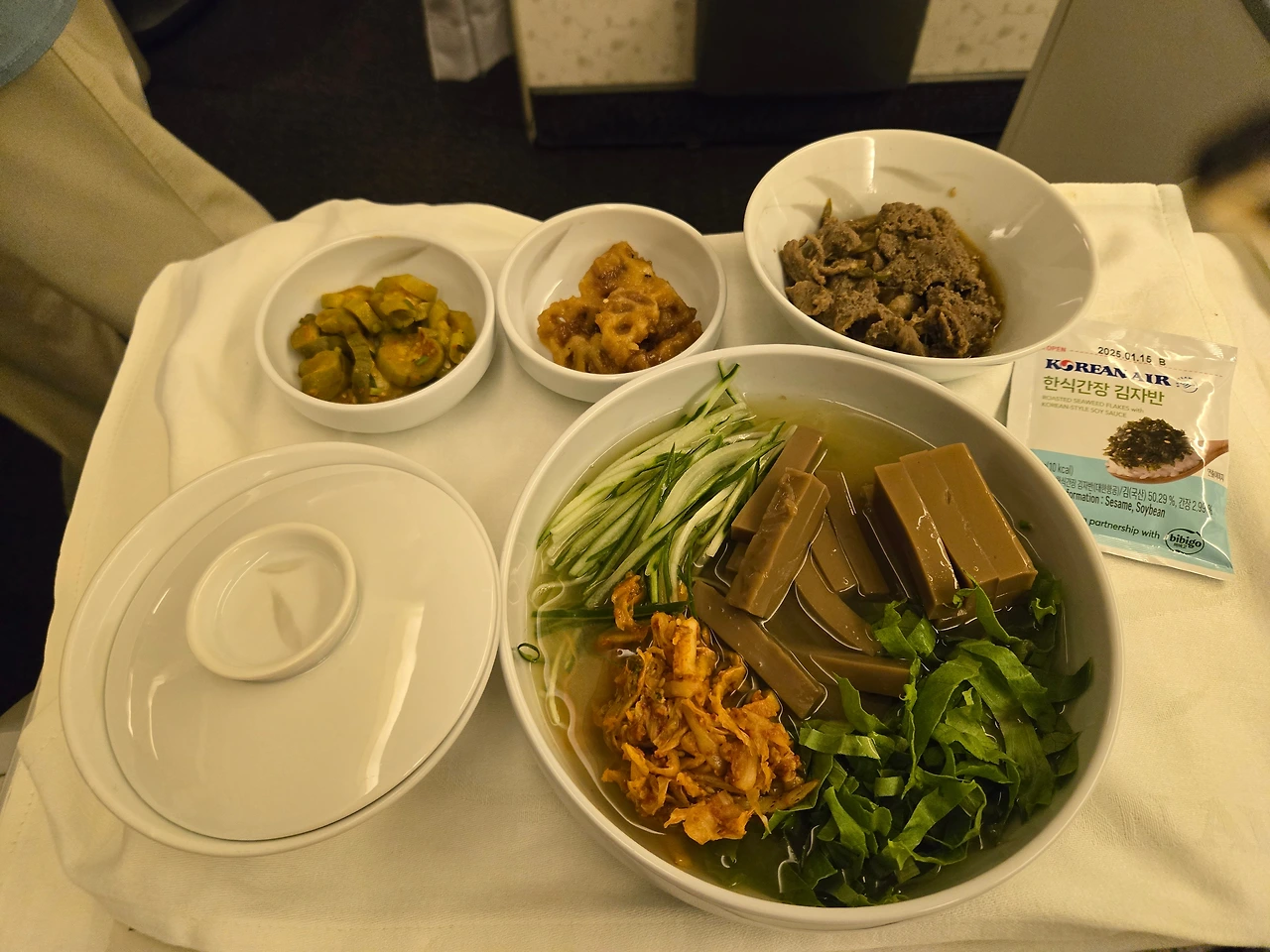 어느새 마음이 스르르 녹아내리며 밤 비행기라 의자를 침대처럼 반듯이 눕고 잠에 취해본다. 눕는 순간 나이 들어 장거리 여행할 때는 돈을 투자해야 할 것 같다는 생각이 저절로 든다. 그런데 이륙하고 누운 지 30분도 되지 않아 저녁식사가 나온다. 메뉴도 미리 골라놓아서 먹음직스러운데 이미 배가 불러 들어가지를 않는다. 평소 먹지 않던 칵테일을 주문하여 마시고 잠에 빠져든다. 8시간은 짧은 건가 보다. 조금 잤나 싶은데 아침 먹으라고 깨운다. 내가 좋아한 묵 밥을 시켰는데도 바라만 보고 식욕이 생기지 않는다. 나중에 이 음식이 생각날 텐데 조바심을 내고 먹으려 했지만 내키지 않아 디카페인 커피를 시켜본다. 커피가 의외로 맛있어서 두 잔을 연거푸 마신다.