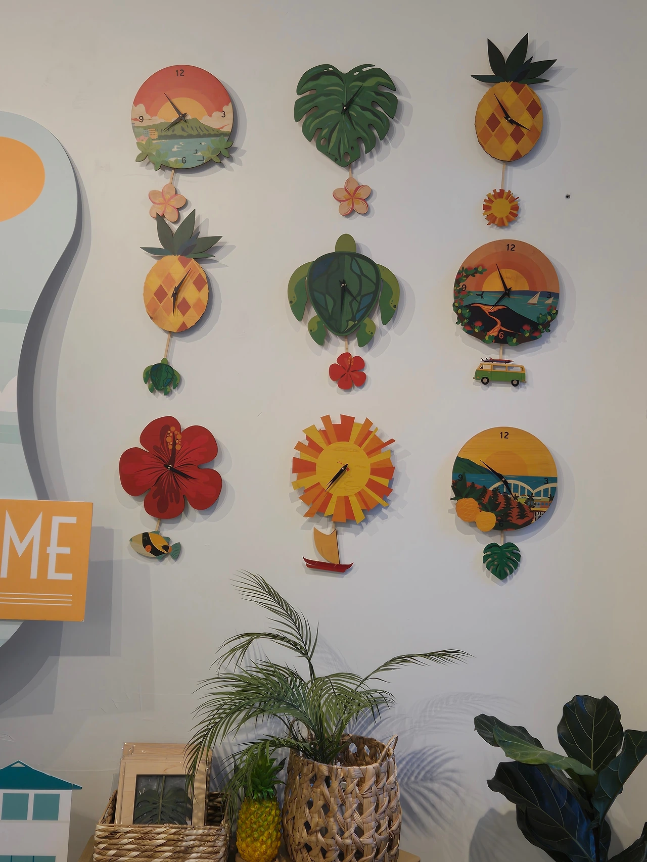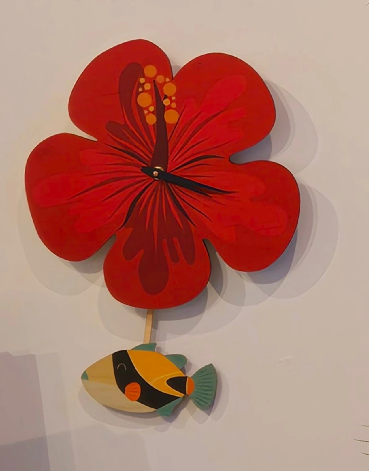 제일 먼저 눈에 띈 것은 하와이 국화꽃인 빨간 히비스커스의 시계와 그 시계밑의 추가 눈에 들어왔다. 하와이 상징꽃인 히비스커스 꽃의 빨간색이 너무 예뻤으나 가격도 비싸고, 특히 시곗바늘이 몇 시를 가리키는지 구별이 되지 않아 물고기 추만 사기로 했다.