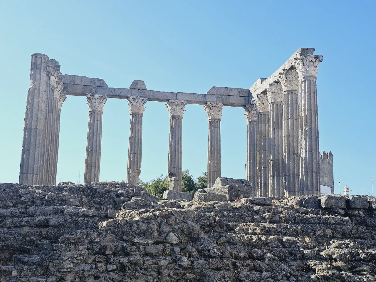 버스에서 내리자 제일 먼저 디아나신전(Templo de Diana)이 우릴 반긴다. 그리스의 파르테논 신전을 연상하게 하는 디아나 신전은 2세기말 로마인들이 여신'디아나'를 모셨던 신전이다. 이베리아 반도에 남아있는 신전 중 가장 큰 규모로 아름다운 코린트 양식의 기둥이 있다. 디아나는 달의 여신으로 영어명은 '다이애나'이며 '빛나는 것'의 의미로 숲의 여신이나 사냥의 신, 임신과 출산을 돕는 신으로 숭배되었다. 화감암 토대 3면에 세로로 지어졌으나 현재는 대리석으로 만든 14개의 코린트식 기둥만 남아있다. 그리스 파르테논을 보아서인지 조금 왜소하게 느껴지고 상당히 많은 부분이 손상되어 있었다. 예전의 신성시되었던 곳이 지금은 폐허처럼 놓여 씁쓸하다.