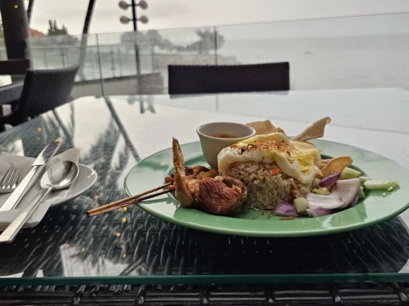 말레이시아 겨울은 가는 곳마다 비가 온다. 페낭도 낮에 햇빛이 비쳤는데 숙소에 도착하자 비가 내리기 시작한다. 페낭의 숙소인 Mercure Penang Beach Hotel은 생각보다 아름다웠다. 로비에 도착하자 눈에 펼쳐진 커다란 야자수 2개 사이로 보이는 바다는 예뻤다. 비록 바닷물은 에메랄드 초록빛은 아니지만 주변이 아름다웠다. 2층 방으로 들어서니 생각보다 아담하고 밖의 야자수는 예쁜 등을 달아 화려하게 빛나고 있었다. 날씨가 좋지 않아 1층 레스토랑에 들어가 밥을 먹는데 생각보다 맛이 있어서 깜짝 놀랐다. 누군가 페낭의 음식이 맛있다더니 사실인가 보다. 저녁과 아침을 구름이 잔뜩 끼어있는 바다를 바라보며 식사를 했다. 긍정적 사고 이어서인지 우중충한 날씨에도 불구하고 음식이 맛있어서 기분이 좋았다.