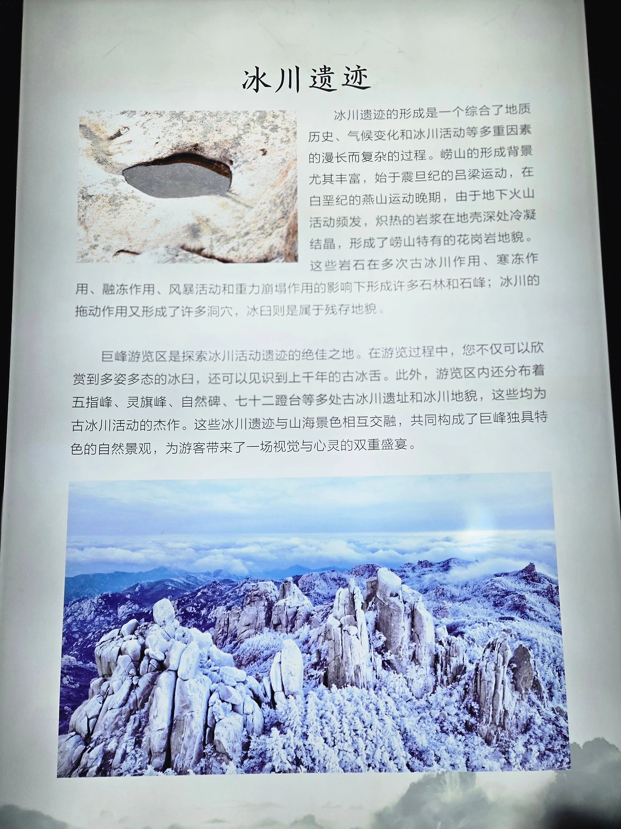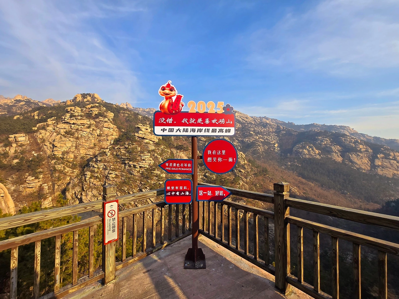 케이블카에서 내리자 넓은 광장이 펼쳐지며 주변으로 기암괴석들이 둘러싸고 있다. 그리고 중국 본토 해안선의 가장 높은 봉우이라는 빨간 팻말이 놓여있다. '청정'으로 알려진 거봉은 노산의 최고봉이자 해발 1132.7m로 '명산 1호'로 알려져 있다. '태양의 거대한 봉우리'의 웅장함과 '운해의 경이로움'그리고 '수정에 걸린 은봉우리'와 '노산 불덩어리의 화려함'이 공존하는 곳이라고 푯말에 적혀있다. 관광지답게 2025년으로 새로 장식된 푯말은 중국인들의 신속함과 관광지에 대한 예의를 보여주는 듯하다.