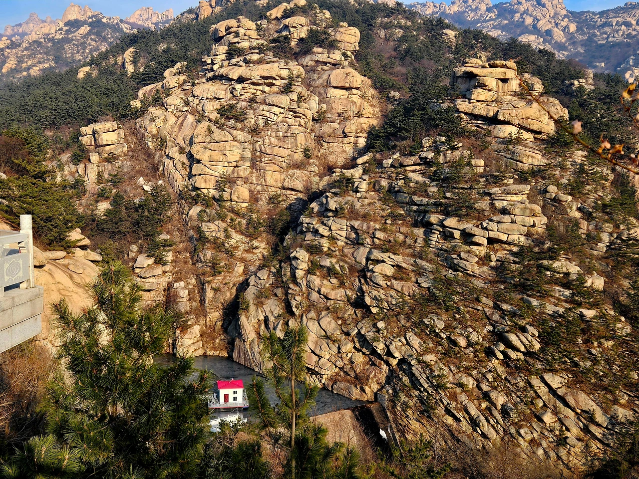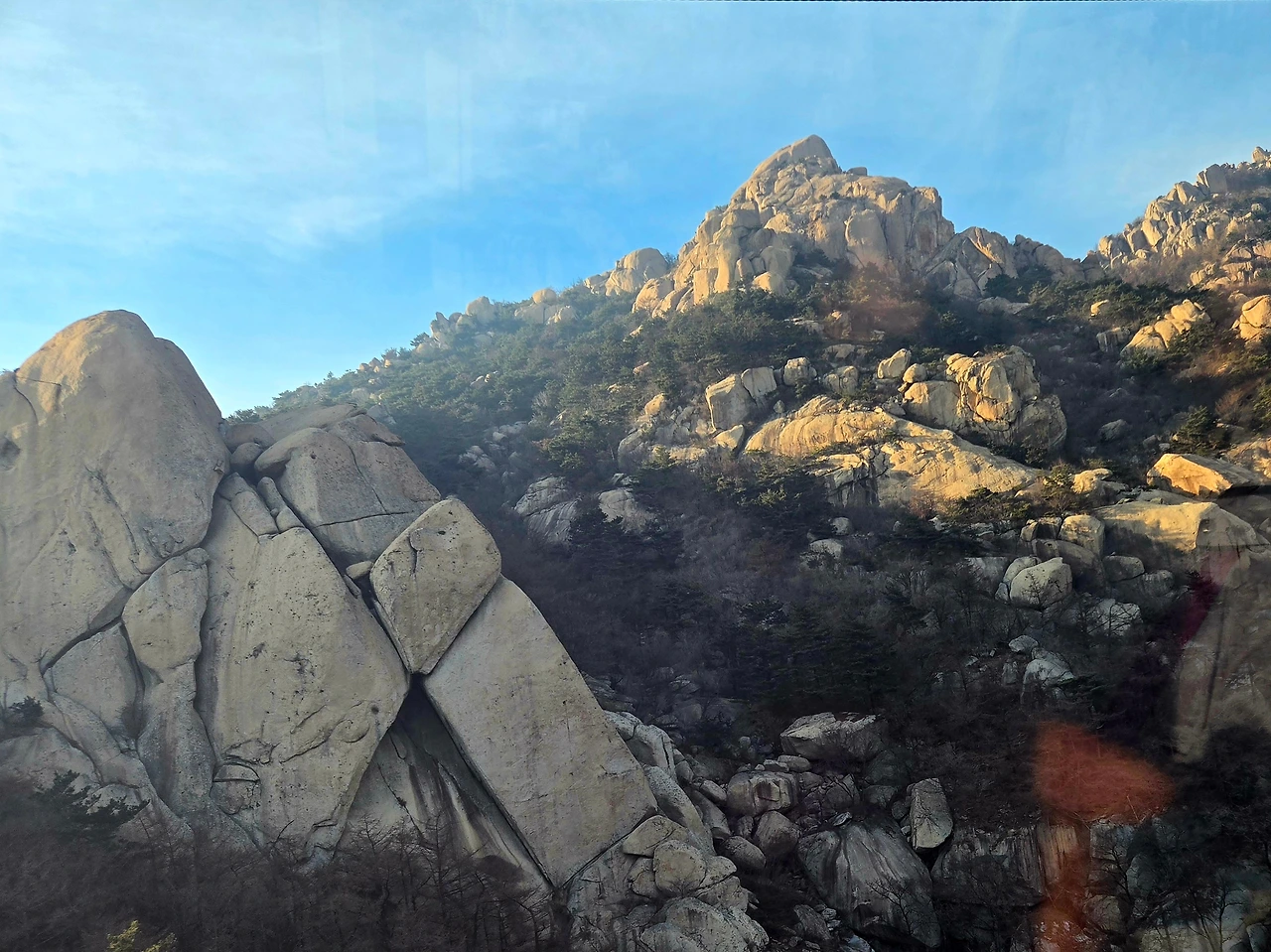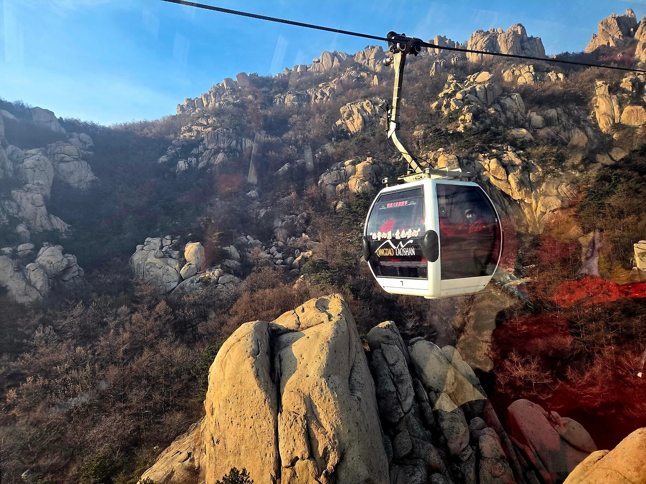 케이블카에 오르자 몇억 년 비바람을 견디어 왔을 바위들이 제각각의 모습으로 노산의 경관을 빛내고 있었다. 지상에서는 도저히 형상되지 않을 바위의 아름다움을 보고, 아마 수억 년 전에 주변 바다의 해수면이 드러나 생기지 않았나 하는 생각마저 들게 했다. 중국은 왜 이런 절경을 가지게 되었을까? 장가계 여행할 때는 손오공이 구름 타고 날아다니고 신선들이 살아있을 것 같은 기운을 보고 감탄하며 우리나라에 없는 산의 신비로움에 질투를 했던 적도 있었다. 중국산을 다녀오면 우리나라 산은 야산처럼 높지도 않고 부드러움을 느끼는 건 나만 그럴까?