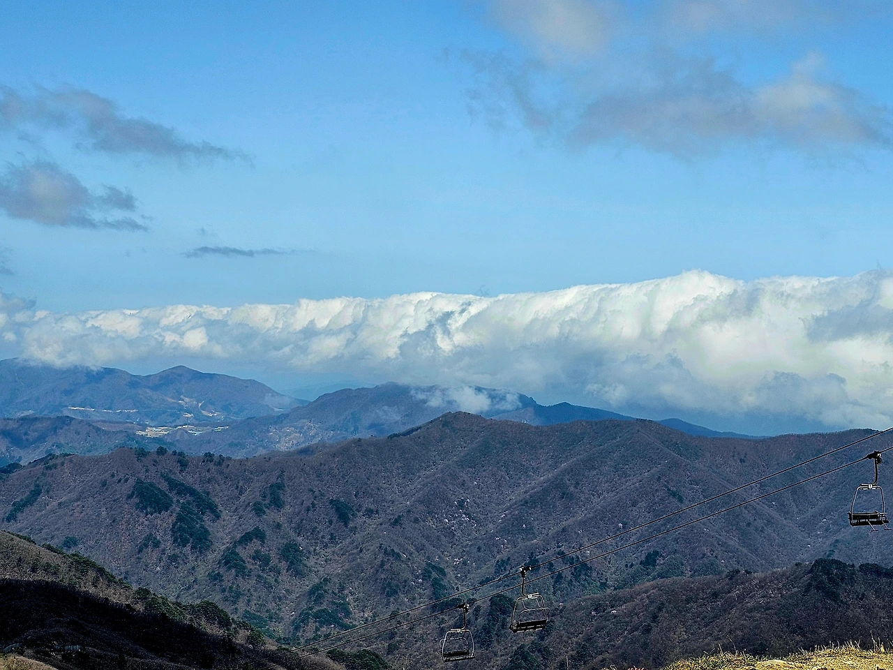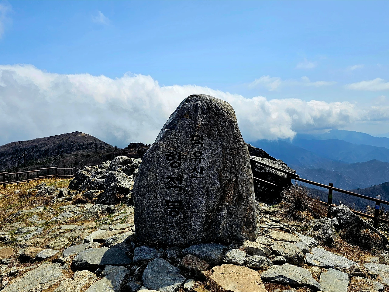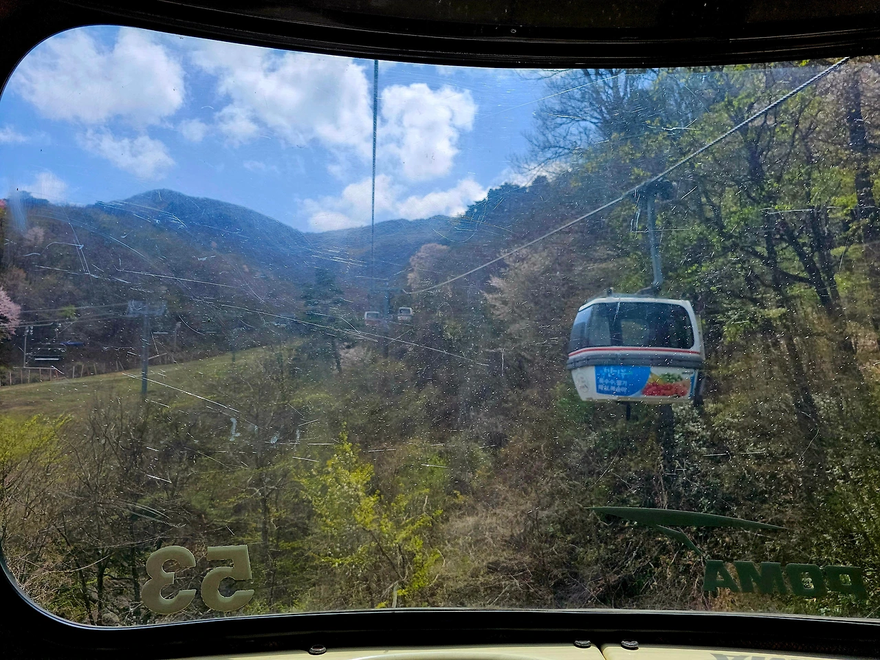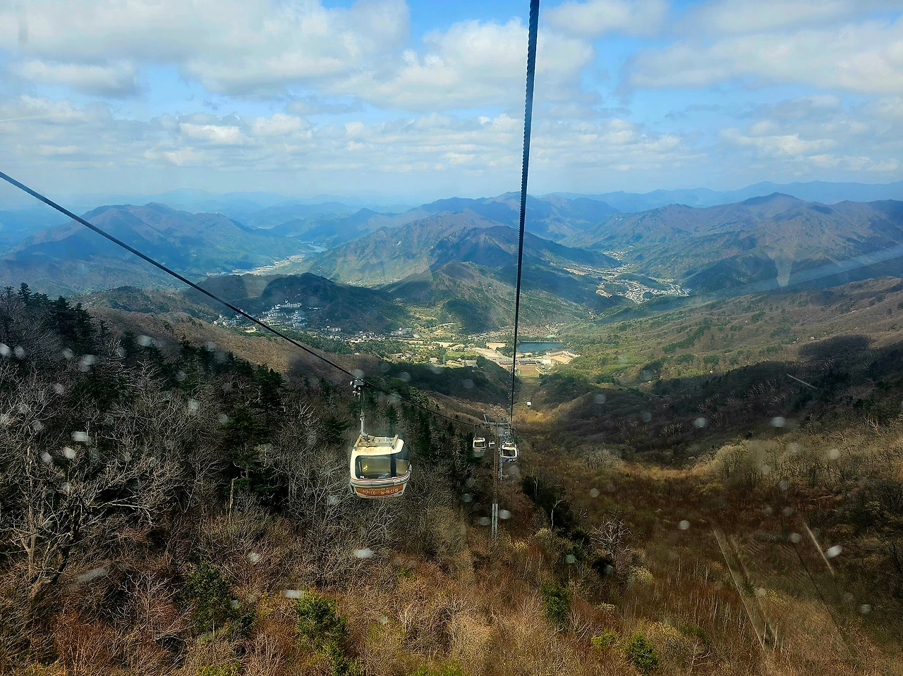 제일 먼저 우리의 발걸음은 전라북도 무주의 덕유산 국립공원 내에 위치한 해발 1,614m의 덕유산 최고봉인 향적봉으로 향한다. 겨울에는 스키를 타는 사람들에게 인기가 있고 봄에는 철쭉과 진달래로 유명하지만, 4월 21일인데도 봄꽃은 보이질 않고 나목들이 산을 배경으로 자태를 뽐내고 있었다. 곤돌라(gondola)를 타고 가며 <어느 산골소년의 사랑이야기>를 친구와 흥얼거리며 차창을 바라보니 꽃도 아름답지만 오히려 덕유산 특유의 담담함을 보여주는 것 같아 좋았다.