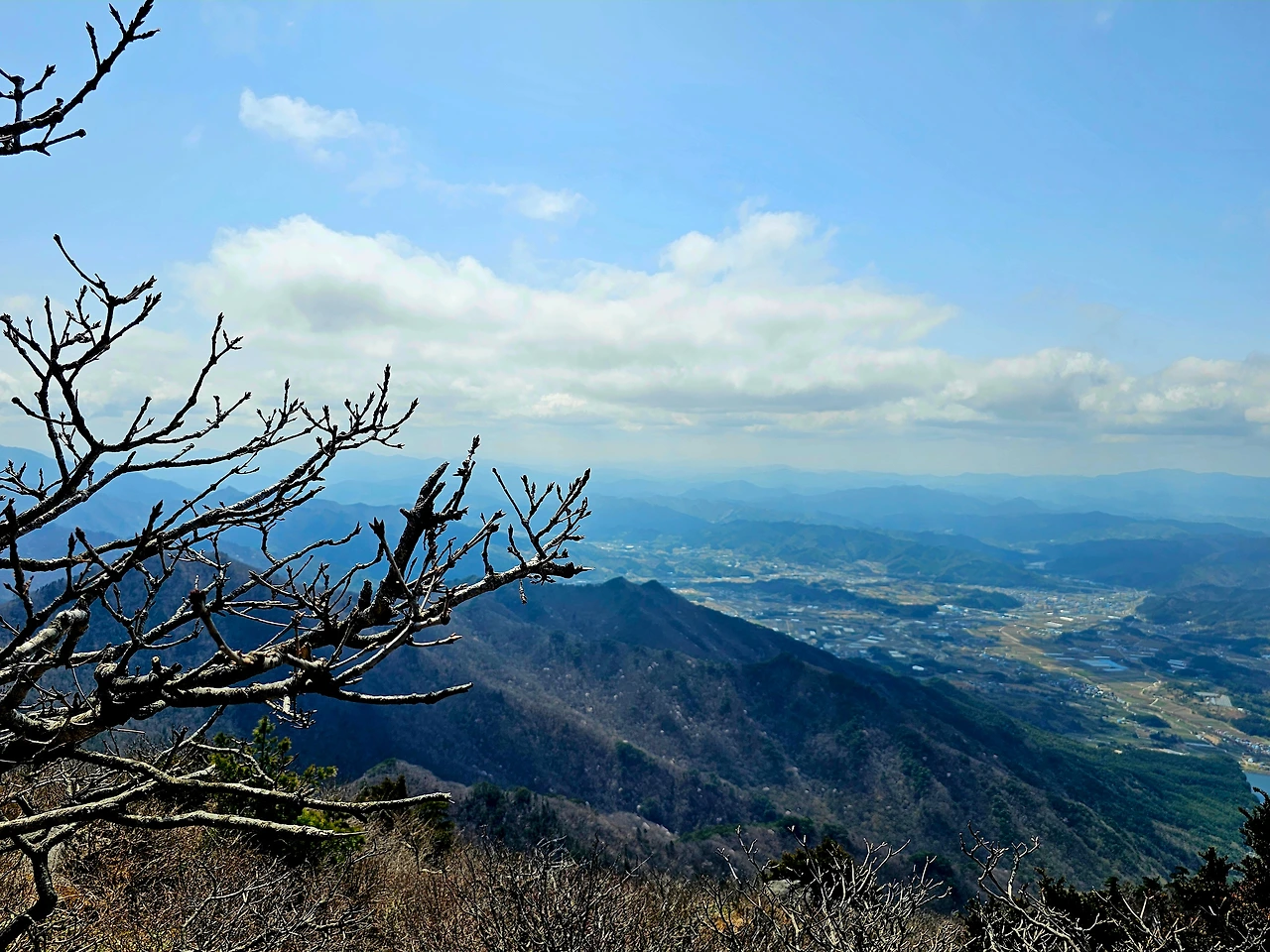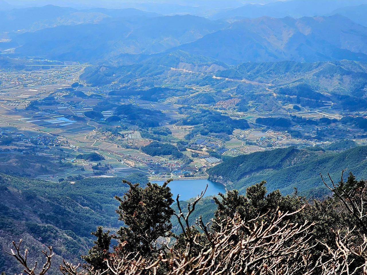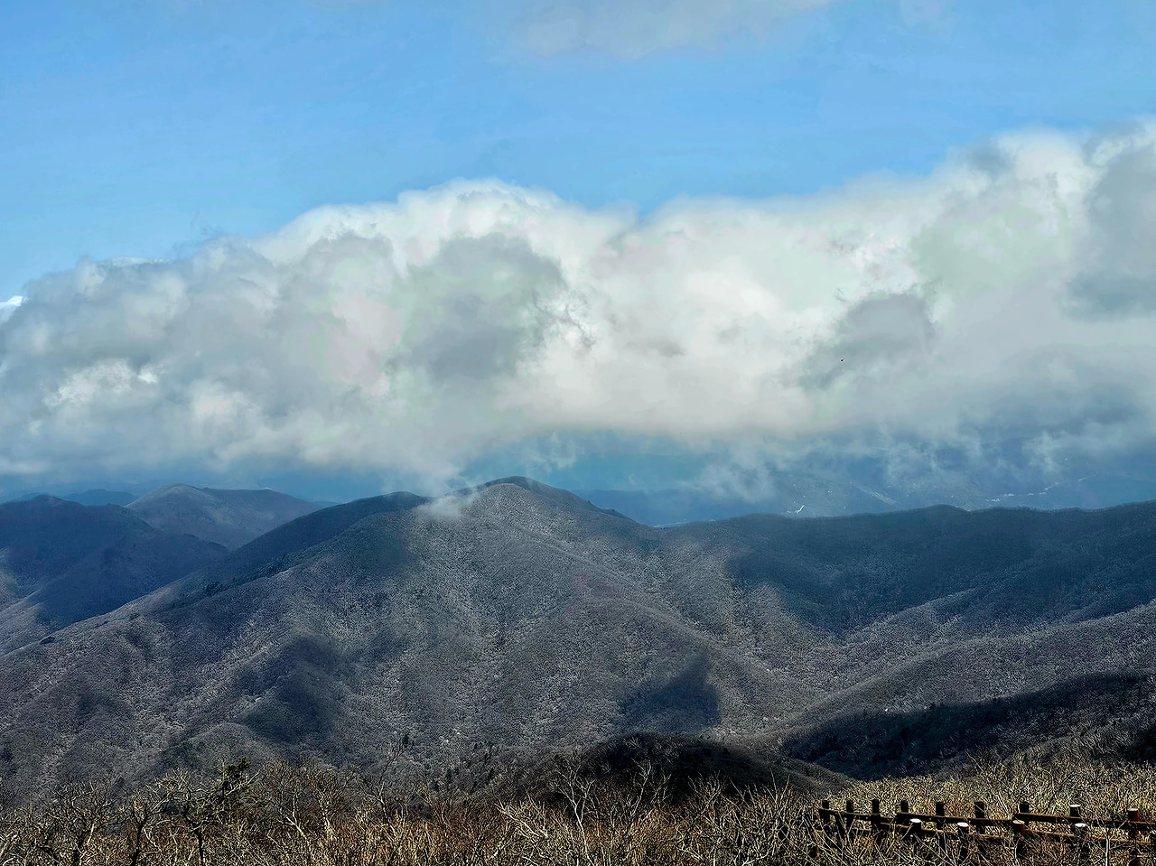 정상을 오르는 계단은 덕유산 아래의 풍광을 고스란히 보여준다. 아직 녹지 않은 눈들도 있고 아직 봄을 맞이하지 못한 주목나무가 나목으로 우뚝 서 위엄을 자랑하며, 하늘과 구름 그리고 강과 산이 서로를 품어 안고 있다