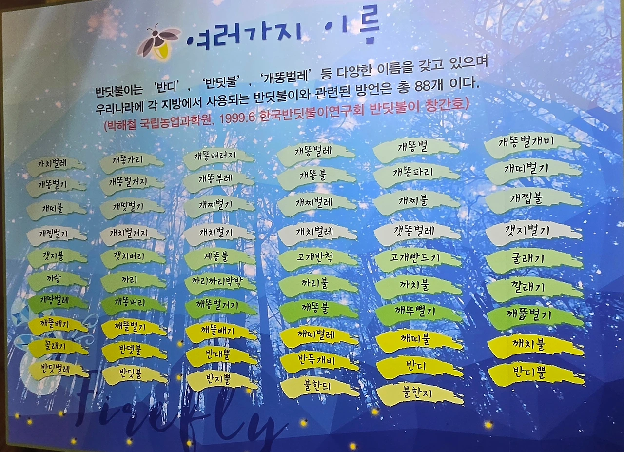 무주 하면 반딧불이를 빼놓을 수 없다. 반딧불이에 ''반디'나 '개똥벌레'등 여러 별칭으로 불러지는데 그중 개똥벌레가 가장 잘 알려졌다. 개똥이 많은 습한 지역에서 자주 발견되어 붙여진 이름과 "개똥처럼 흔하다"는 의미에서 개똥벌레라는 이름을 가졌다는 반딧불은 흔하기는 하지만 자기 본연의 빛을 발하는 생명체이다.