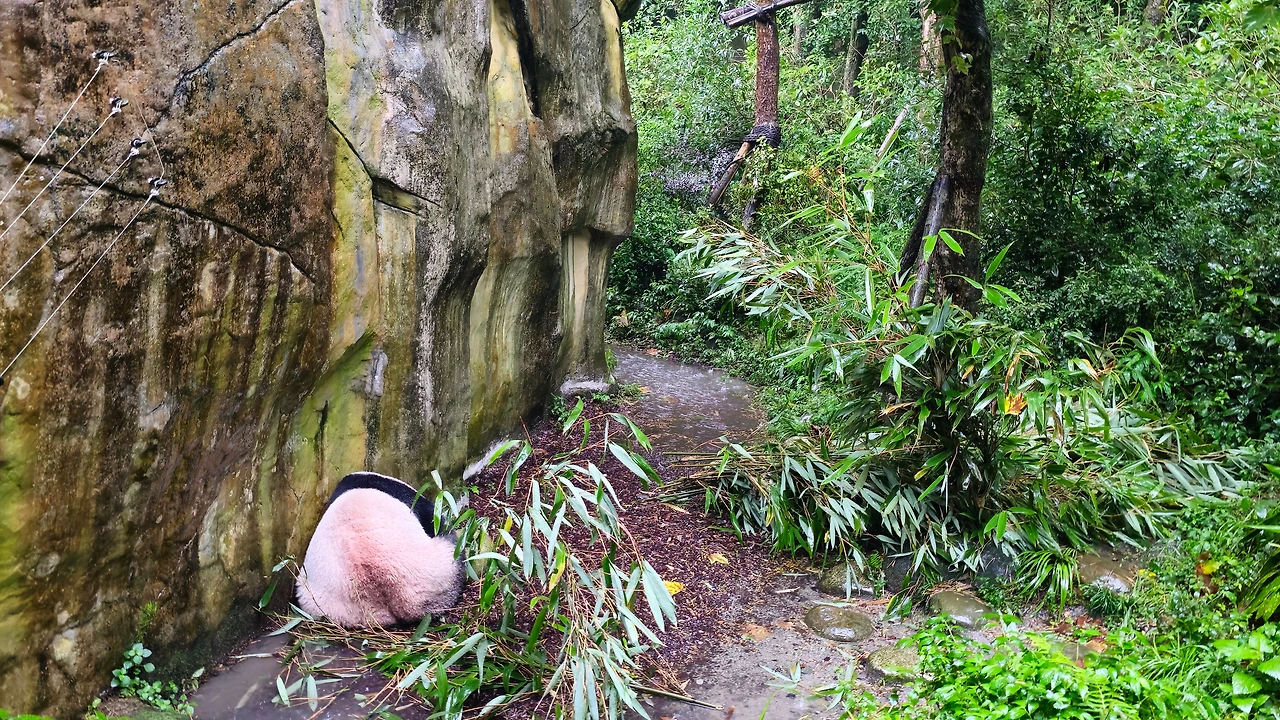 대나무 숲에 둘러싸여 있는 우리는 다행히 곰들이 나와 있었다. 빗방울이 세차게 내리는데도 바위틈이나 대나무 아래 웅크리고 자고 있었다. 비가 오는데도 왜 밖에서 자나 궁금했는데 두꺼운 털 덕분에 비에 어느 정도 젖어도 체온 유지가 가능하고 오히려 우리 안보다 바깥이 더 시원하거나 통풍이 잘 되어 바깥에서 자는 걸 선호한다고 한다. 비 오는 것이 자연스러운 환경처럼 받아들이고 깊은 잠을 잔다고 한다.