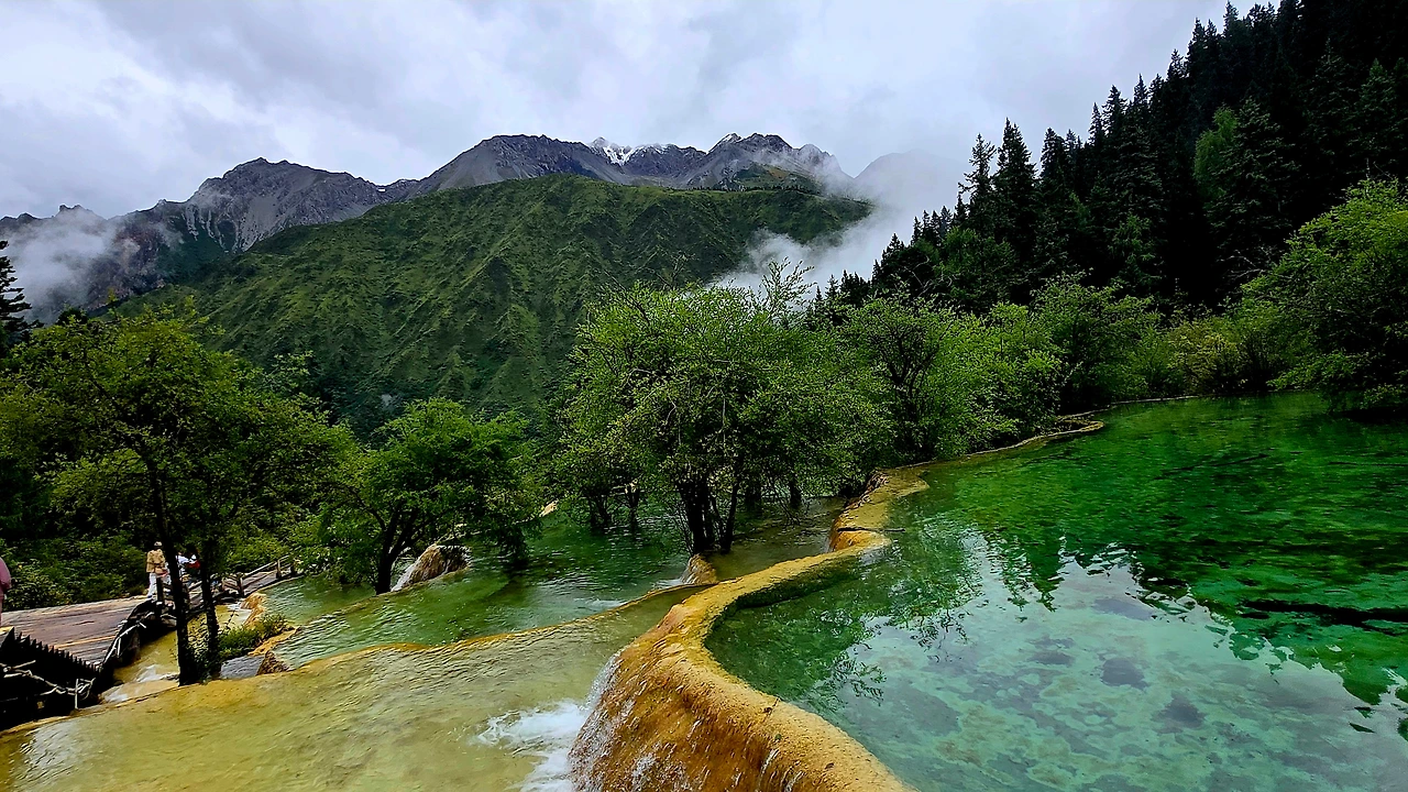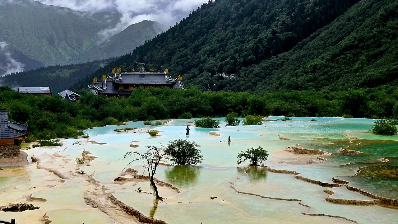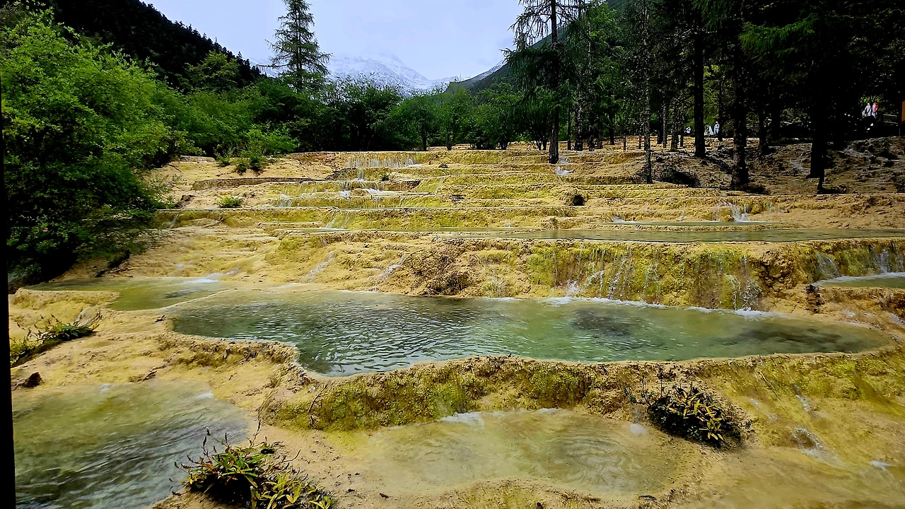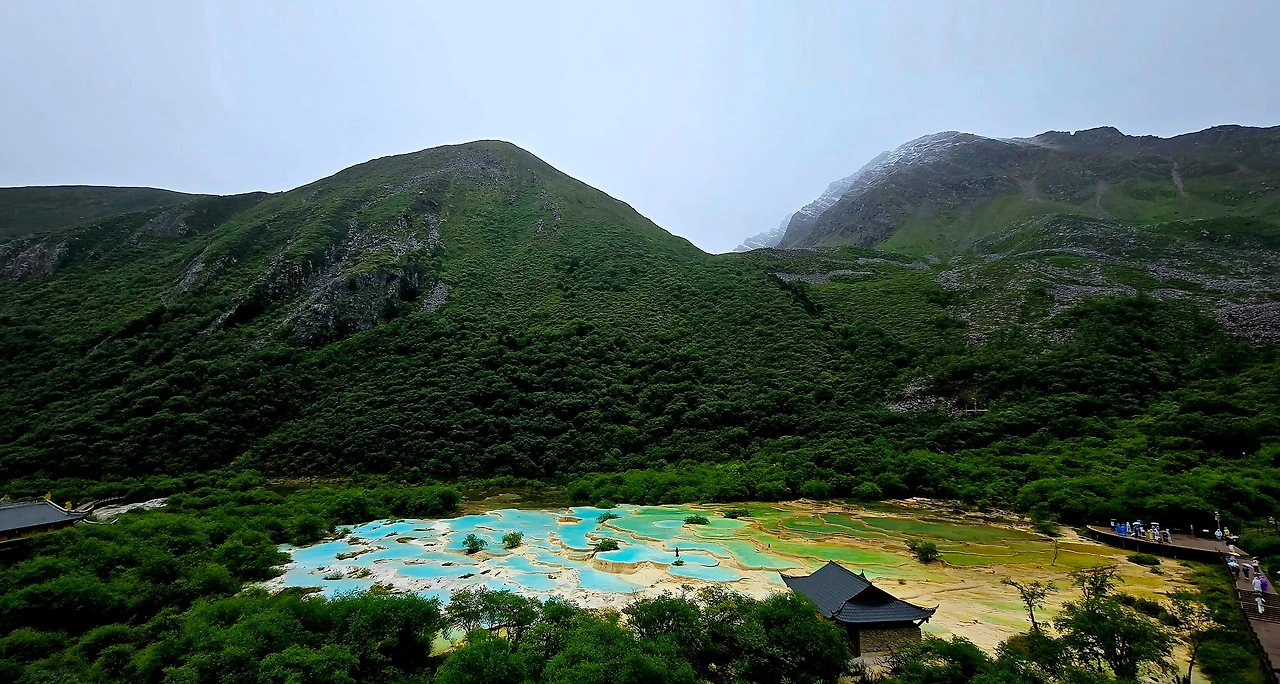 드디어 푸른빛, 청록, 금빛, 심지어 보랏빛까지 형형색색의 물빛이 층층이 펼쳐져 있어서 위에서 내려다보니 계단식 작은 연못들이 환상처럼 눈앞에 들어온다. 어제 구채구의 물빛과는 또 다른 바다빛의 작은 각각의 연못들이 아기자기하게 각각의 신비로운 색상을 뿜어내고 있었다. 이런 색상의 물을 앞으로 보게 될 수 있을까? 어디에서도 본 적이 없는 너무 예쁜 색상이었다. 물의 색상이 이렇게 아름다울 수 있다니 저절로 감탄이 나온다. 멀리 보이는 설산을 배경으로 다랭이 논처럼 계단식으로 펼쳐진 작은 연못들의 끝자락엔 멋진 황릉 사원이 위풍당당하게 서있다.