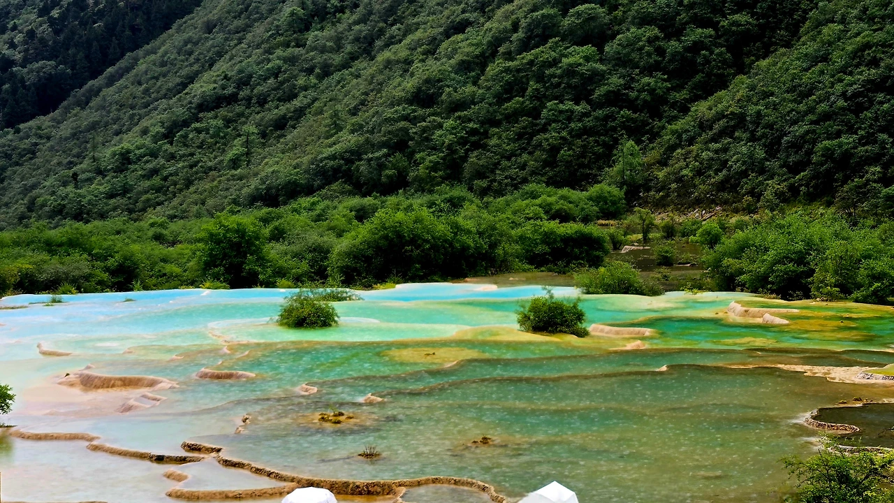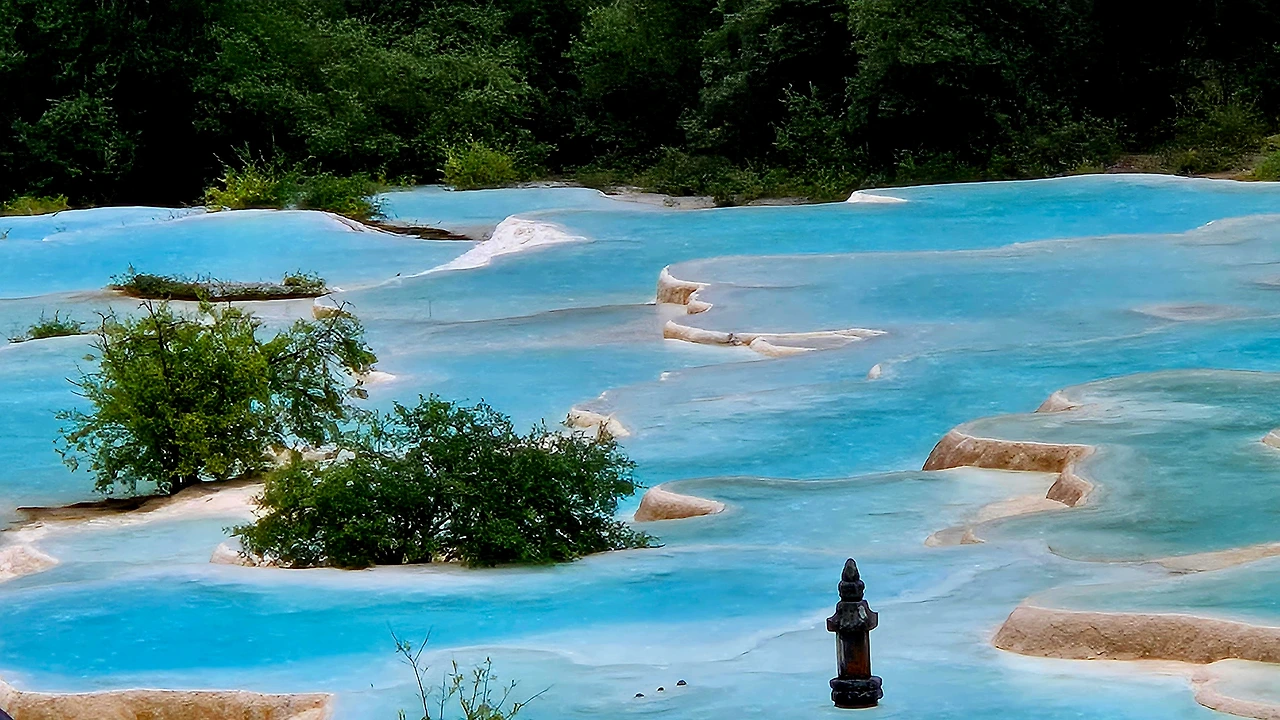 황룽 오색연못의 청록과 파란색이 생기는 이유는 지하수 속에 녹아든 칼슘 성분이 표면에 침전되면서 계단식 석회암 지형을 만들었고, 이것이 연못과 호수의 “자연 그릇”이 되었다고 한다. 햇빛이 들어올 때 광물질이 만나 굴절·반사가 달라지면서 물빛이 파랑·초록·노랑·청록 등으로 다양하게 보인다고 한다.