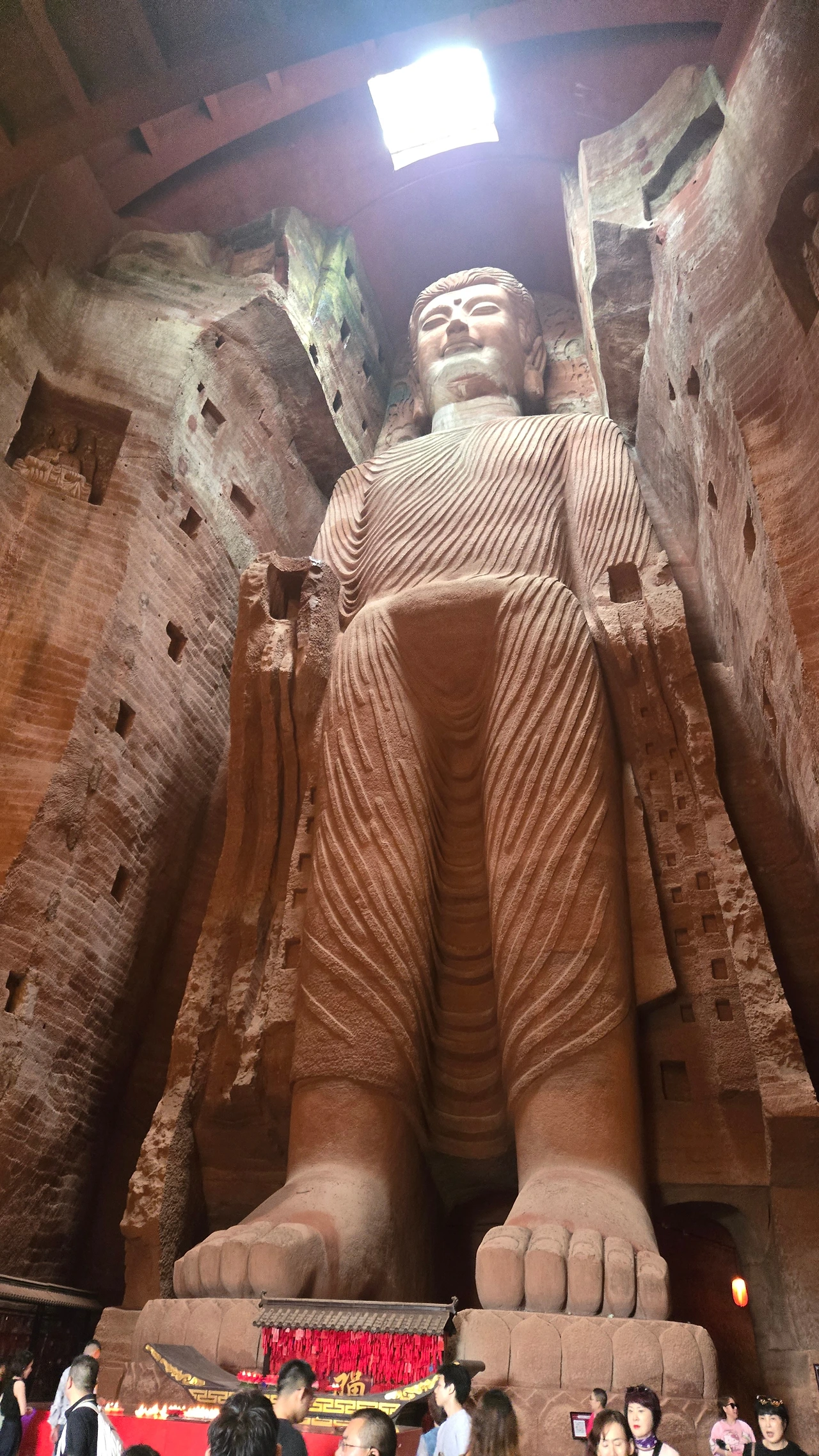 높이 약 71m이고 귀 길이 7m에 달하는 이 거대한 불상은 오랜 세월의 시간이 말해주듯 이끼가 끼어있고 비바람에 시달려 부처의 모습이 더 온화하게 보이게 만든다. 머리 부분의 조각, 귀의 구멍, 큰 발등 등에 나타난 세밀한 손길은 절벽을 깎아 만들었다고 믿기 어려울 정도로 정교하게 조각되어 있었다.