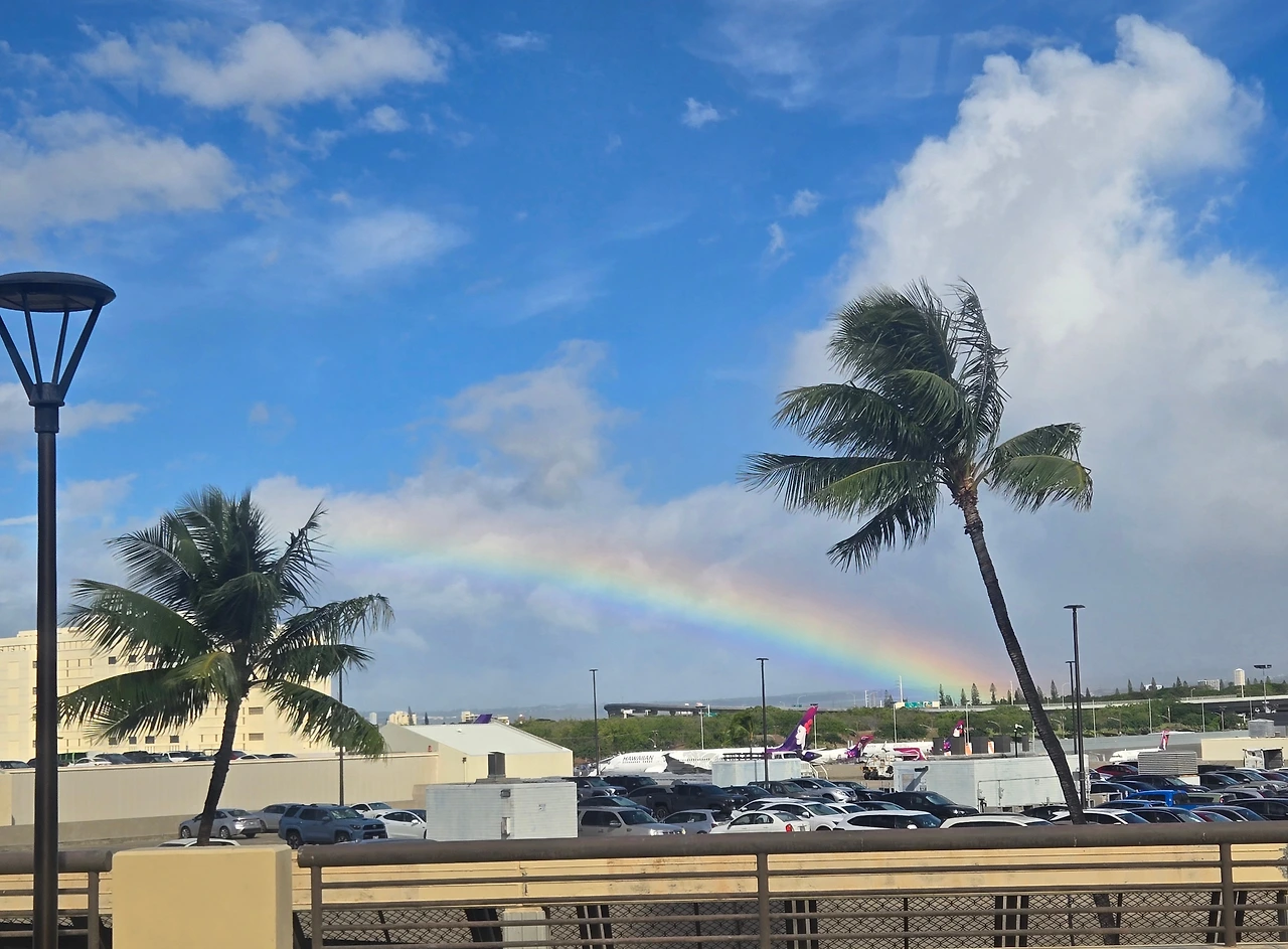 공항에 내리자마자 공항 주변에 선명한 무지개가 반겨준다. 한국에선 보기 드문 무지개가 이곳은 깨끗한 공기사이로 선명한 무지개를 볼 수 있어서 하와이에 왔다는 실감이 난다. 자동차 번호판에도 무지개가 그려있어서 "무지개의 수도(rainbow capital of the world)"로 불려지는 하와이는 자연의 아름다움을 반영한 하와이의 상징을 보여주는 듯하다. 공항에서 무지개를 보니 좋은 일이 있을 것 같다.