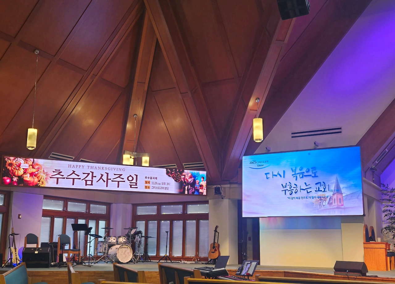 맞는 말이다. 항상 있는 것이니 당연한 것처럼 받아들이고, 없는 것을 찾아 불평만 한 날들이 더 많은 것 같다. 나도 올 한 해를 보내며 내 주변의 사람들에게 감사하고 고마운 마음에 한국 떠나오기 전 그런 말을 주변 사람들에게 전한 적이 있어 특히 공감되는 설교였다. 옆에 대형 스크린으로 한국어로 표현을 글자로 써주고 한국말로 진행하는 설교여서 노인들이나 이민온 어린아이들도 쉽게 이해할 수 있게 해 준다.