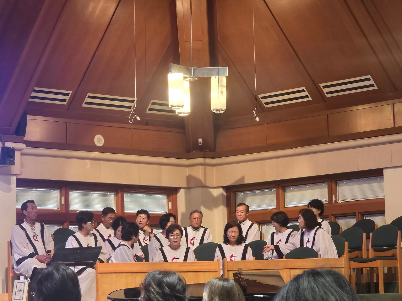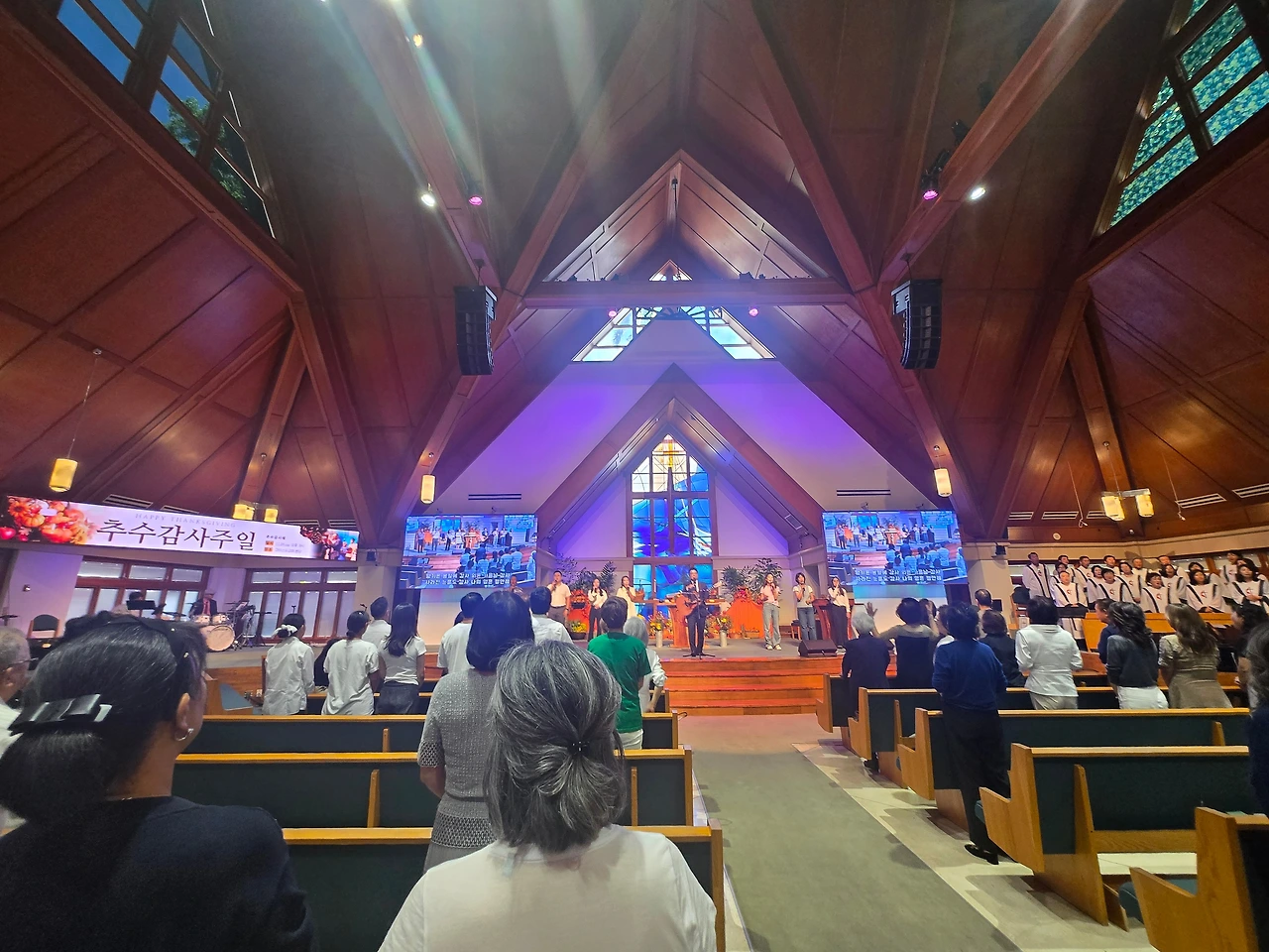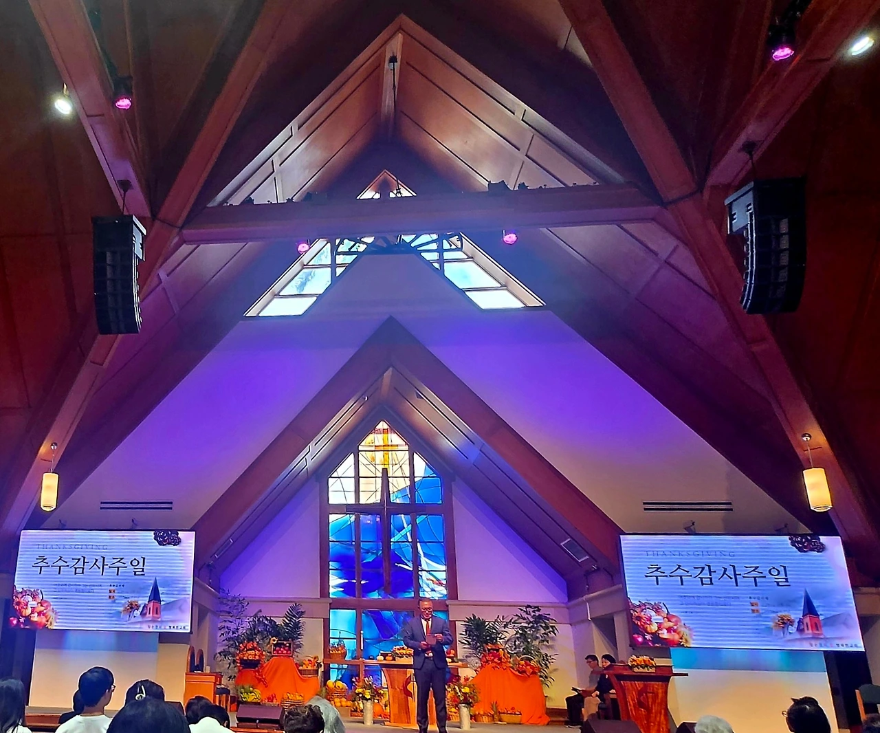 내부로 들어가니 초대형 스크린이 양옆에 있고 제단에 온갖 과일바구니로 가득하였다. 각 지부에서 보내온 추수감사절의 의미로 보내온 과일바구니들이었다. 마치 한국의 제사상에 햇곡식과 과일이 올려져 조상에 대한 차례를 올리는 추석을 연상하게 하여 흥미로웠다. 십자가 위 스테인드 글라스(stained glass) 사이로 흔들리는 야자수 나무가 보인다. 설계할 때 연출된 것인지 우연인지는 알 수가 없다.