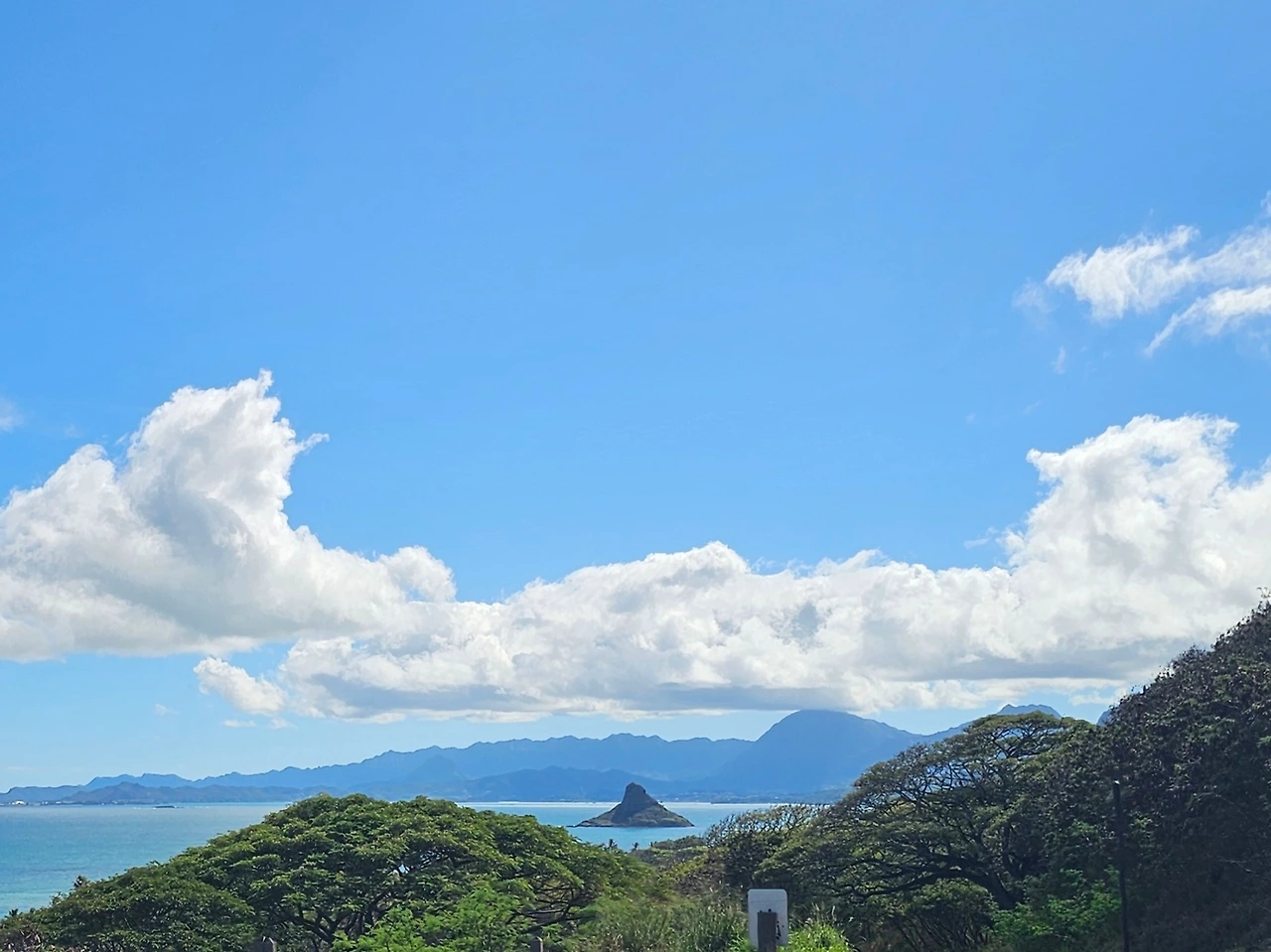 하와이 여행은 와이키키 해변이 아니라 이곳이 paradise라고 불릴 정도로 정말 아름다운 곳이었다. 250만 년 전의 화산폭발로 인해 해저가 솟아올라, 수만 년 지나며 뾰쪽하고 가파른 절벽과 날카로운 능선은 대 자연이 빚은 조각품으로 수많은 영화배경으로 삼기에 충분하다. 능선을 따라 펼쳐지는 광활한 바다는 모자섬을 배경으로 구름들이 수평선에 열을 맞춰 풍광을 더 아름답게 하고 있었다.