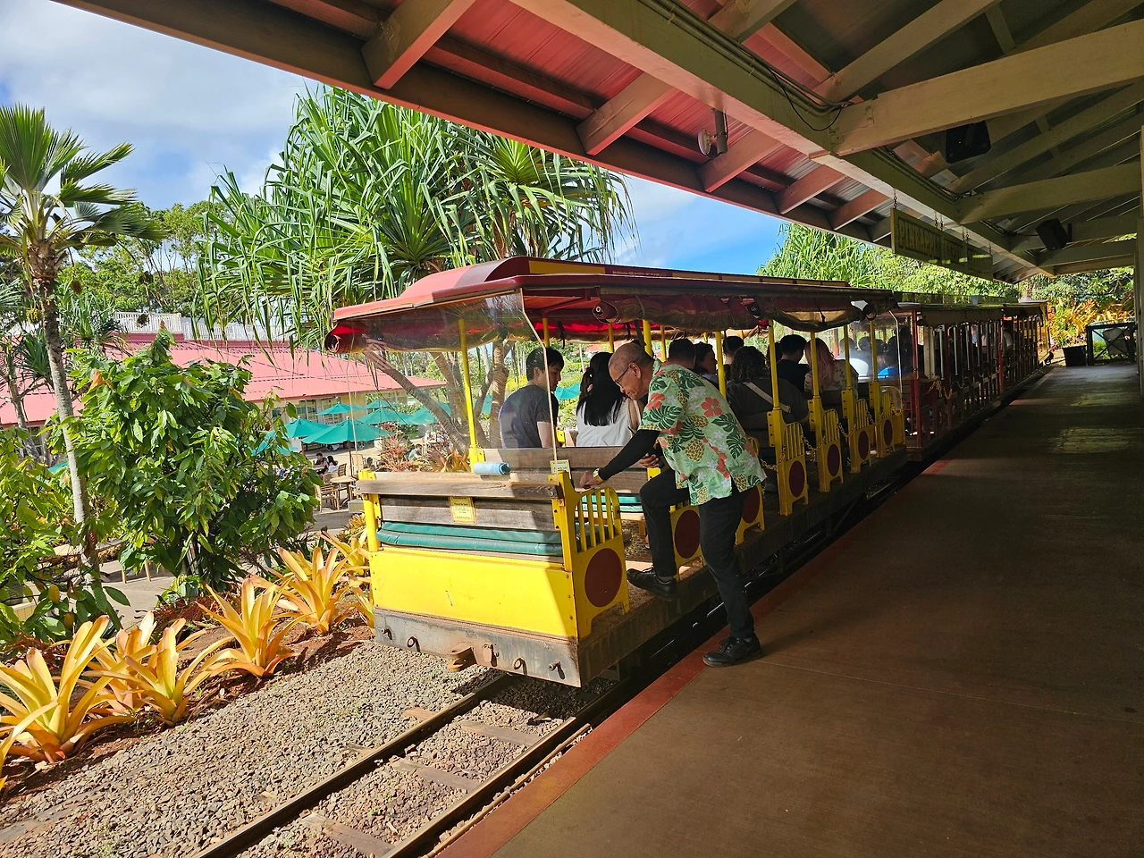나도 아이스크림을 사들고 잘 가꾸어진 농장 정원 주변을 둘러본다. 농장 전체를 둘러보기 위해 파인애플 익스프레스(Pineapple Express) 투어 티켓을 샀다. 긴 대기줄이 있어 한참을 기다려 타는데 혼자 여행이다 보니 좌석 앉는 것도 안내인의 간섭을 받아 조금 불편했다. 20분 정도 진행되는 투어는 Dole의 창립역사와 파인애플뿐만 아니라 카카오, 사탕수수, 레몬 등 다양한 열대과일과 식물들이 광활한 대지에 뜨거운 햇살을 받으며 자라는 장소 등을 설명해 주며 지나간다