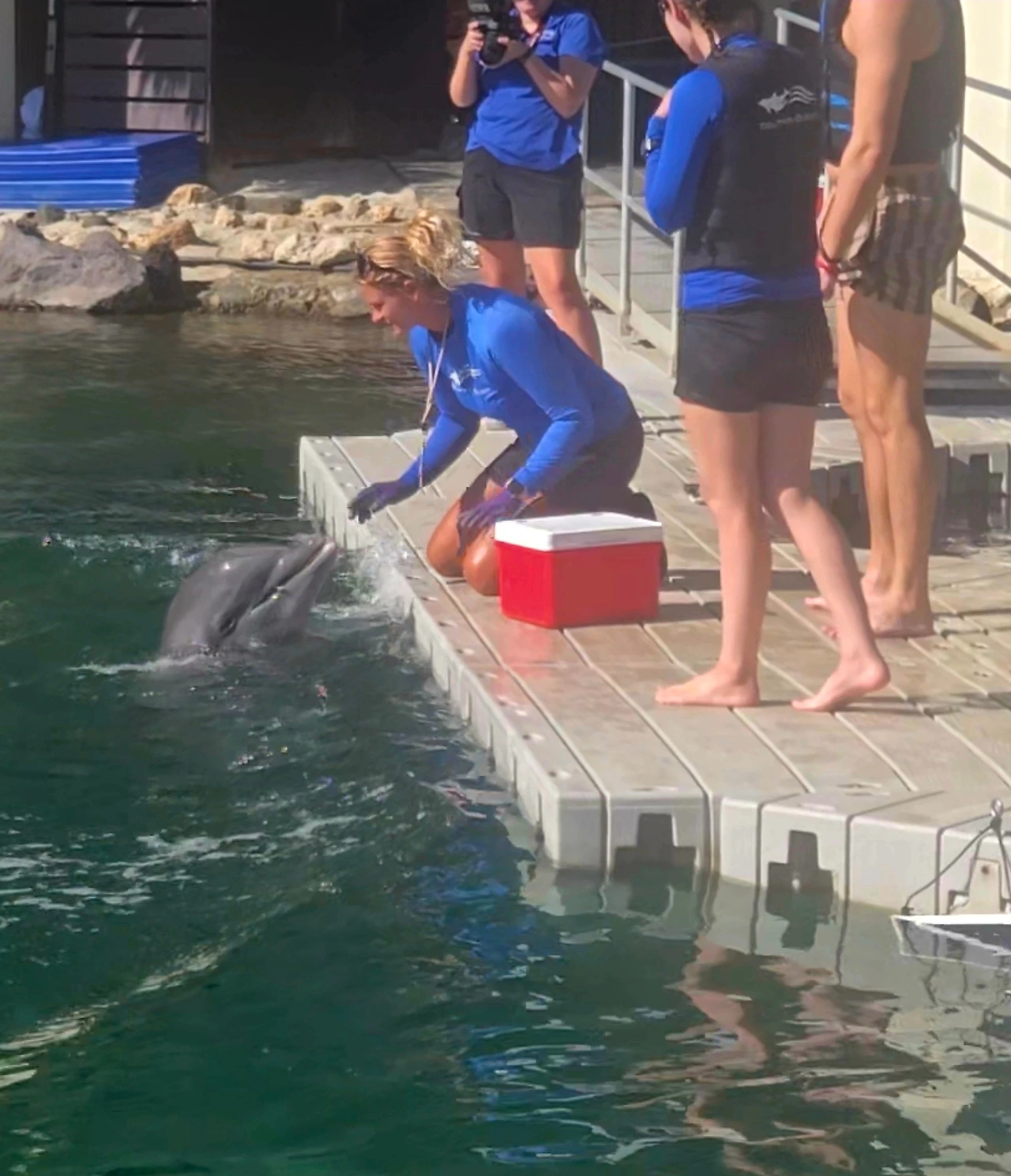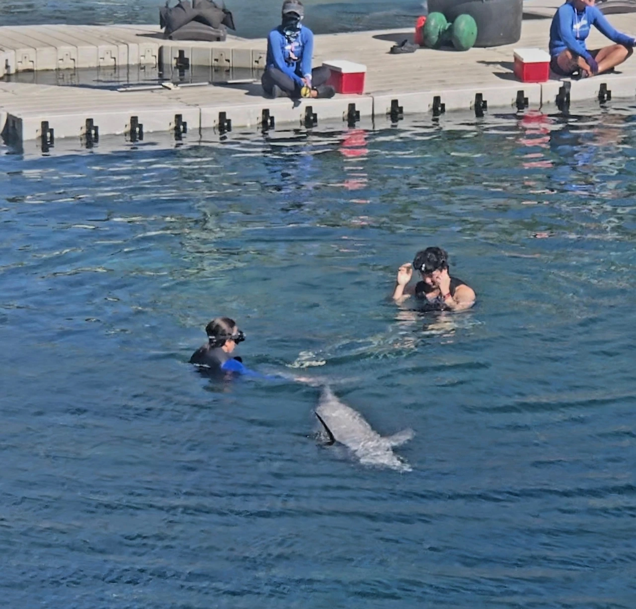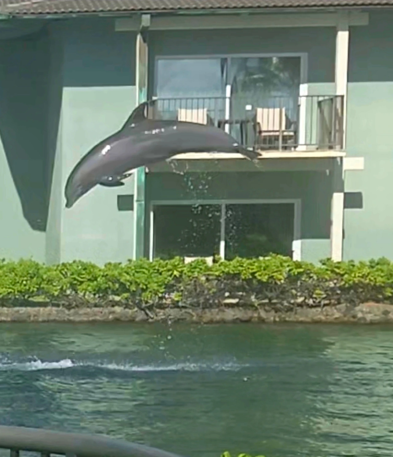 카페 근처로 옮겨 자리에 앉아 몸을 쉬고 있는데 앞 수영장의 돌고래가 헤엄치는 모습이 보인다. 날렵하게 움직였다가 배를 내밀고 배형을 하듯 움직이는 처음 보는 돌고래 모습이 신기하다. 친근함을 보이기 위해서나 기분 좋을 때 돌고래들이 배를 내밀고 수영을 하는 행동이라 한다. 돌고래 체험프로그램도 있어서 체험 중인 남자가 훈련사와 돌고래를 만지며 수영하는 모습도 보인다. 무심히 넋을 잃고 보다 가까이 내려가보니 마침 돌고래 훈련사들이 돌고래를 훈련시키고 있었다. 수영장 세 곳에 분산된 훈련사들이 돌고래가 다가와 입을 벌리며 먹이를 먹기위해 입을 벌리자 훈련사가 먹이를 주며 한쪽 방향으로 물을 탁 치니 그쪽 방향을 향해 쏜살같이 헤엄쳐 다른 훈련사에게 먹이를 얻고, 다시 먹이를 주며 다른 쪽 훈련사 방향으로 물을 튕기니 물치는 방향으로 돌고래가 움직였다. 돌고래가 영리하다더니 물의 움직임으로 훈련사의 의도를 알아차리는 것도 신기하였다. 특히 이렇게 먹이를 먹은 후 멀리 날아올라 몇 바퀴 몸을 돌리는 모습은 최고였다. 칭찬은 돌고래를 춤추게 한다라는 표현이 떠오르게 한다. 춤을 추는 돌고래의 모습은 훈련이라기보다는 그 모습에서 기쁨으로 솟아올라 춤을 추는 인상을 주었다.