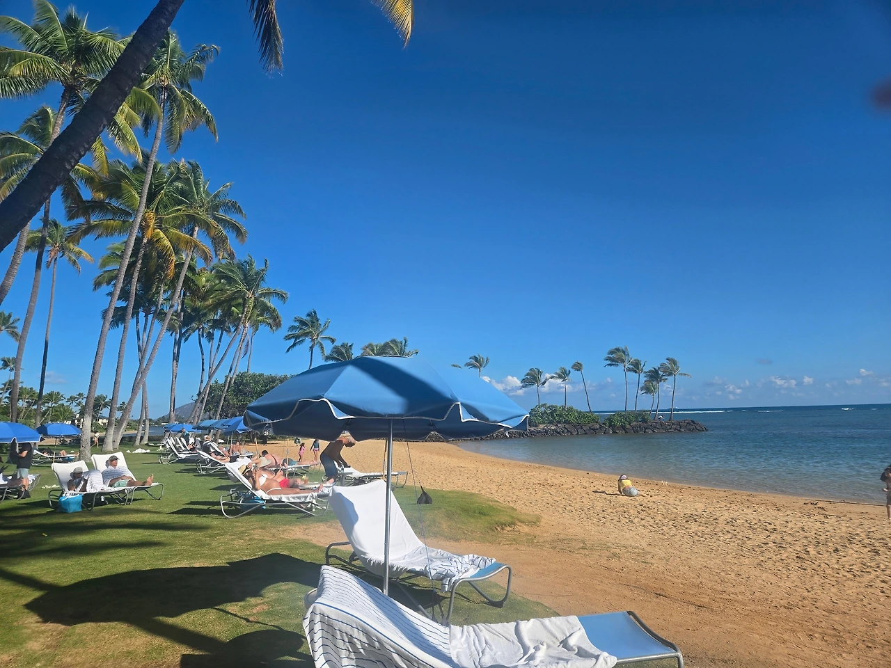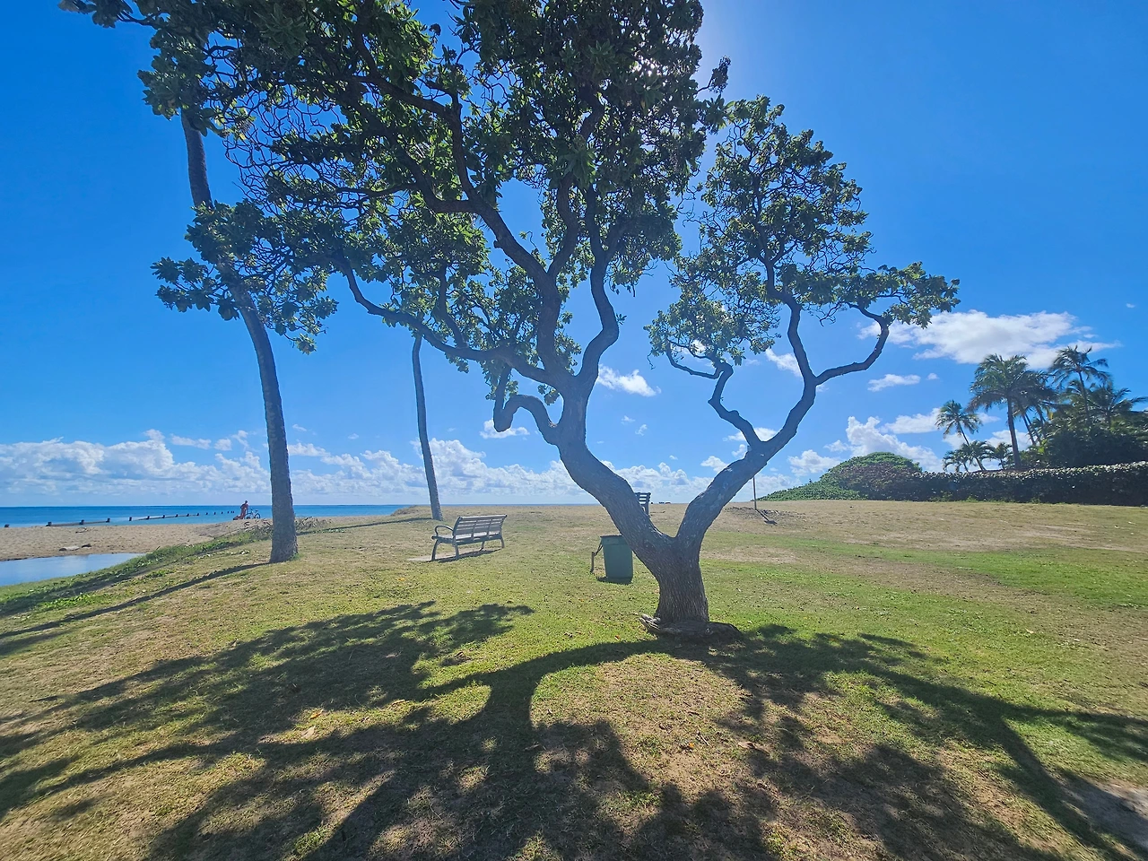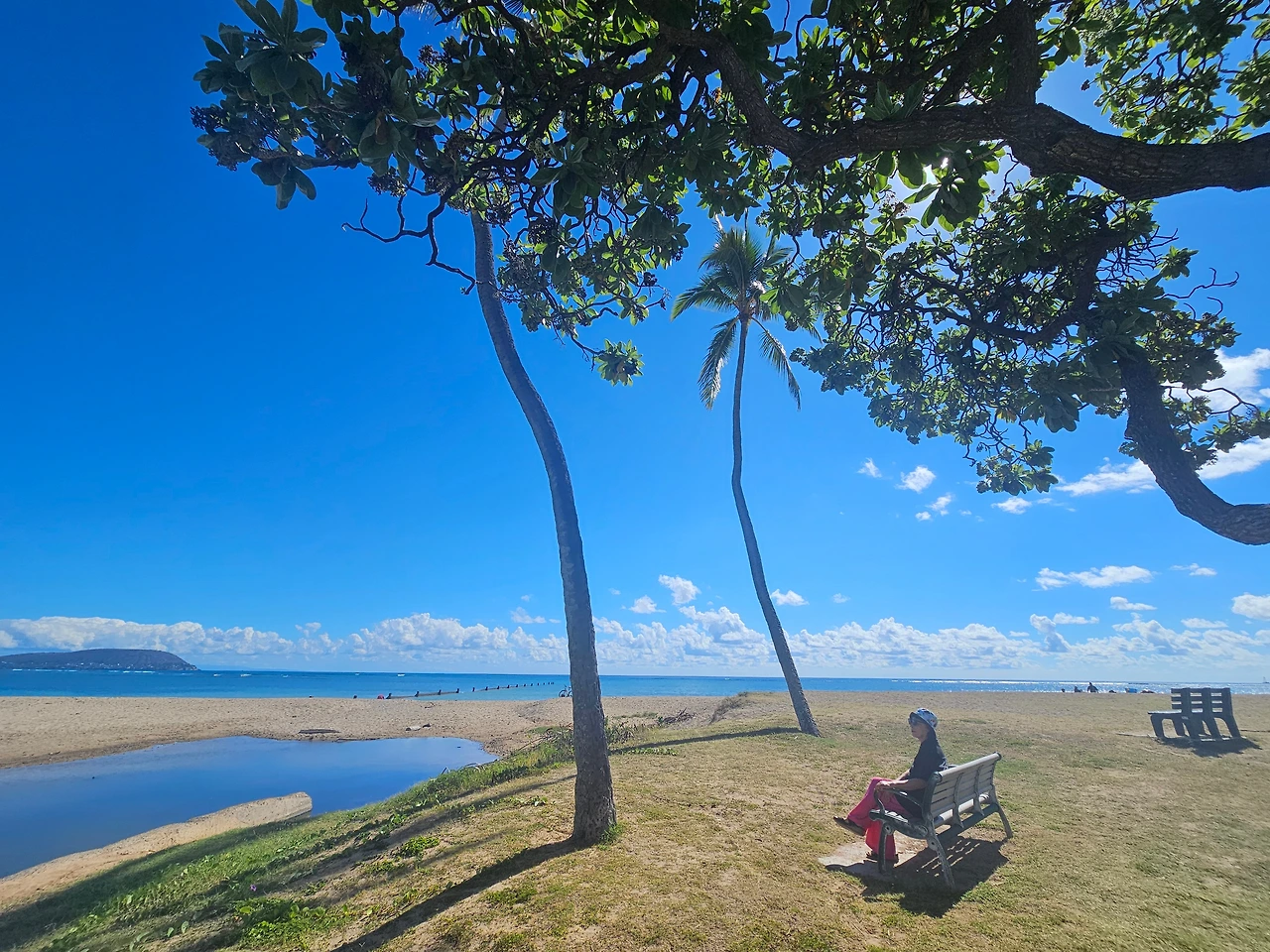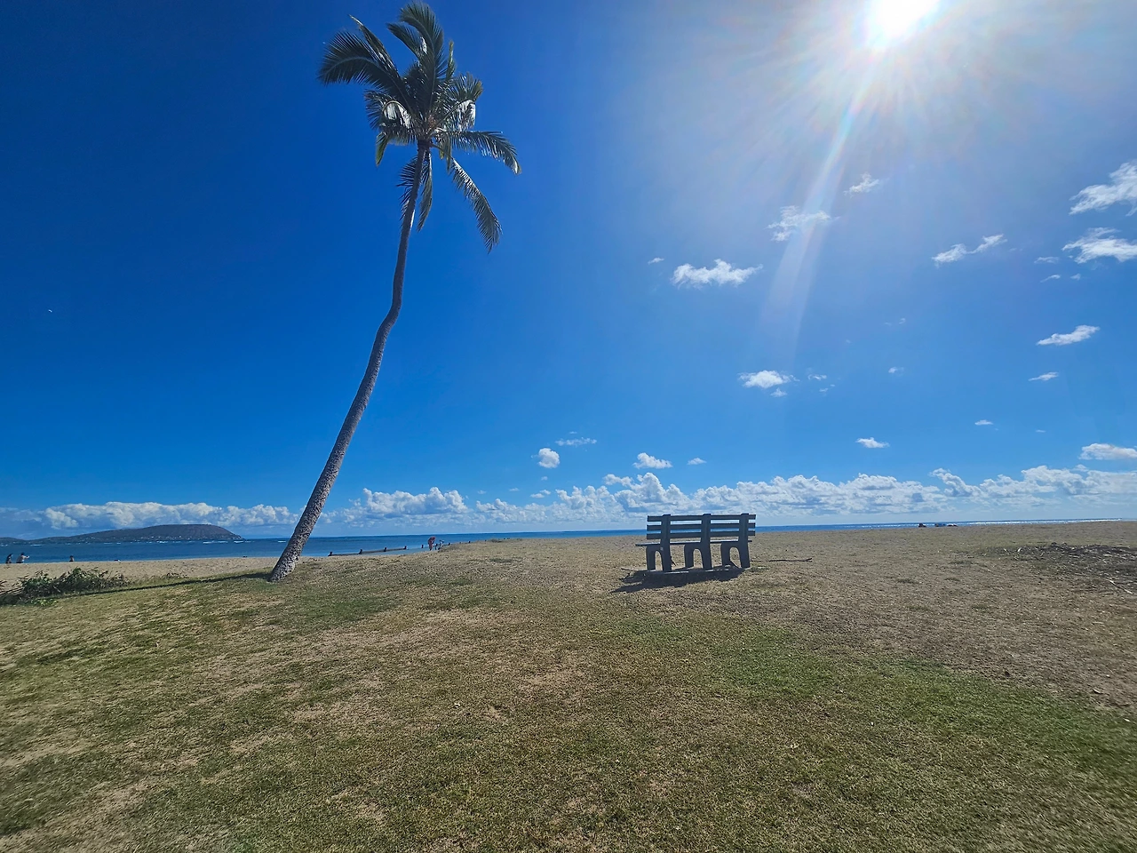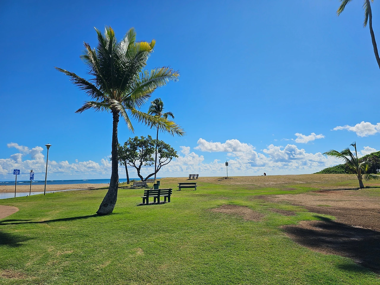 주변경치가 아름다워 여유롭게 카할라비치에 도착한 나는 사람들이 거의 없는 영화 속 한 장면으로 들어가게 된다. 무한한 바다가 펼쳐지고 키 큰 야자수가 듬성듬성 있는 넓은 공간에 몇 개의 벤치만이 사람을 기다리는 듯 놓여있다. 사람이 보이지 않고 자연 그대로 풍광이 날것으로 펼쳐진다. 파란 바다가 펼쳐진 광활한 푸른 잔디밭에 이끌려 발을 디디며 한 편의 영화 주인공이 되어 벤치에 앉았다. 이곳은 현지인들이 즐겨 찾는 곳으로 파도가 잔잔하고 사람이 적어 명상이나 산책할 때 너무 좋을 것 같은 경치였다. 이런 좋은 곳에 사람이 없다는 것이 신기하다. 주변을 살펴보니 수영을 즐기기 위해 온 사람들이 반대편 나무그늘에 옹기종기 모여있는 것이 보인다. 정말 평화스러운 멋진 모습이다. 하늘과 구름이 조화를 이루고, 파란 바다와 푸른 잔디 그리고 점점이 장식된 야자수 나무는 한 폭의 그림이었다. 그 장소를 보는 것만으로도 힐링이 된다.