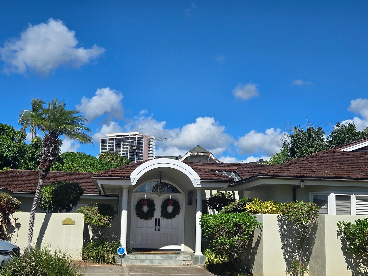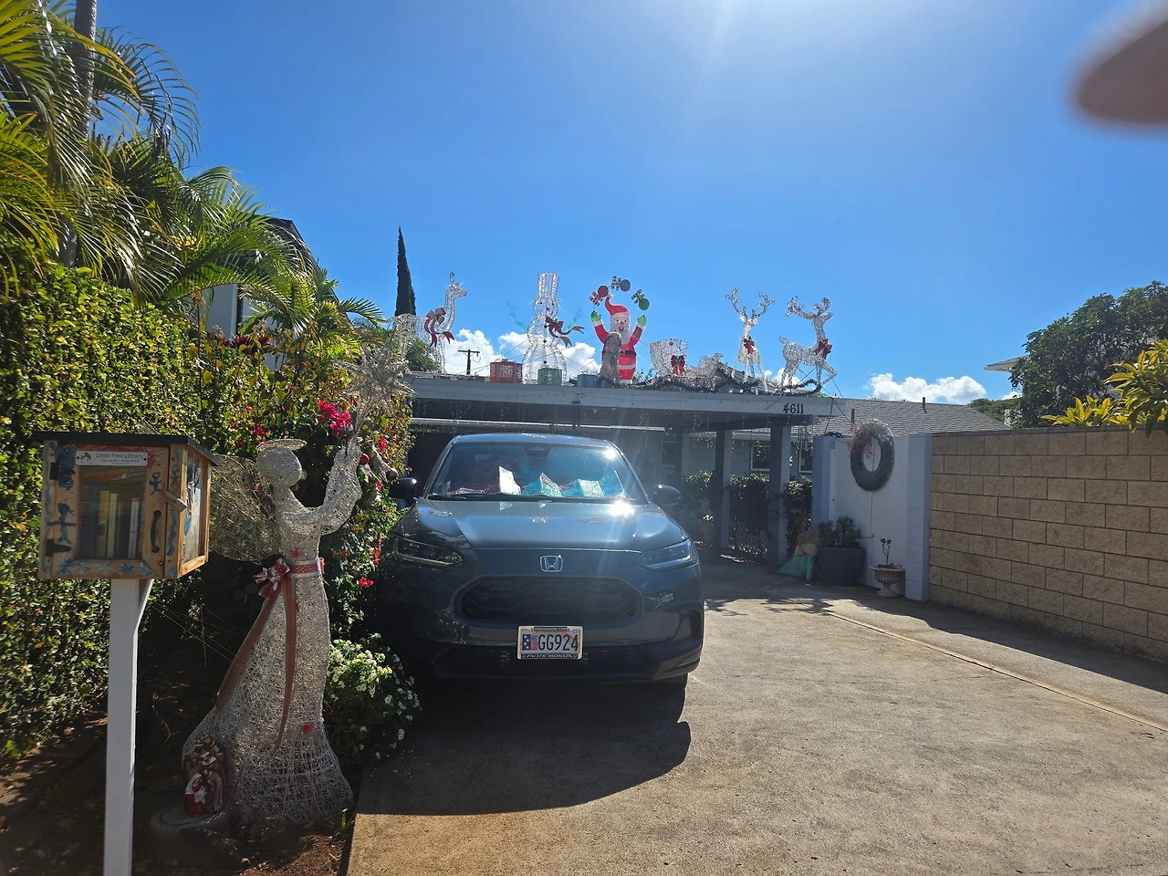 하와이 호노룰루의 대표적인 산 <다이아몬드 헤드>를 끼고 카할라비치에 자리 잡은 카할라호텔과 리조트를 가기 위해 버스에 올라탄다. 지도상으로 버스에서 내려 25분 정도 걸어야 하는 길이지만 그 주변이 부촌으로 소문난 지역이라 집 구경도 하고 천천히 걸어가리라 마음먹는다. 카알라몰까지는 무사히 버스에서 내렸으나 땡볕을 걷는 것이 힘들 것 같아 우버택시를 부르려다 집들이 너무 예뻐 걷기로 결심한다. 나처럼 걸어서 가는 사람이 눈에 띄지 않았지만 지도에 의존해서 걸어가며, 집들 사진도 찍고 뜨거운 햇살아래 펼쳐지는 담장의 꽃들을 바라보며 걷는다. 각자의 개성 있는 집들이 주인의 성격처럼 대문부터 아름답게 장식되었다. 특히 크리스마스를 맞이하여 담벼락이나 지붕 위에 장식한 산타클로스와 크리스마스트리가 맑은 하늘아래 빛나고 있다. 그들은 어떤 삶을 살고 있을까 그들의 삶이 갑자기 궁금해진다. 열대지역의 뜨거운 태양 아래 크리스마스를 보는 것은 흥미로운 일이다.