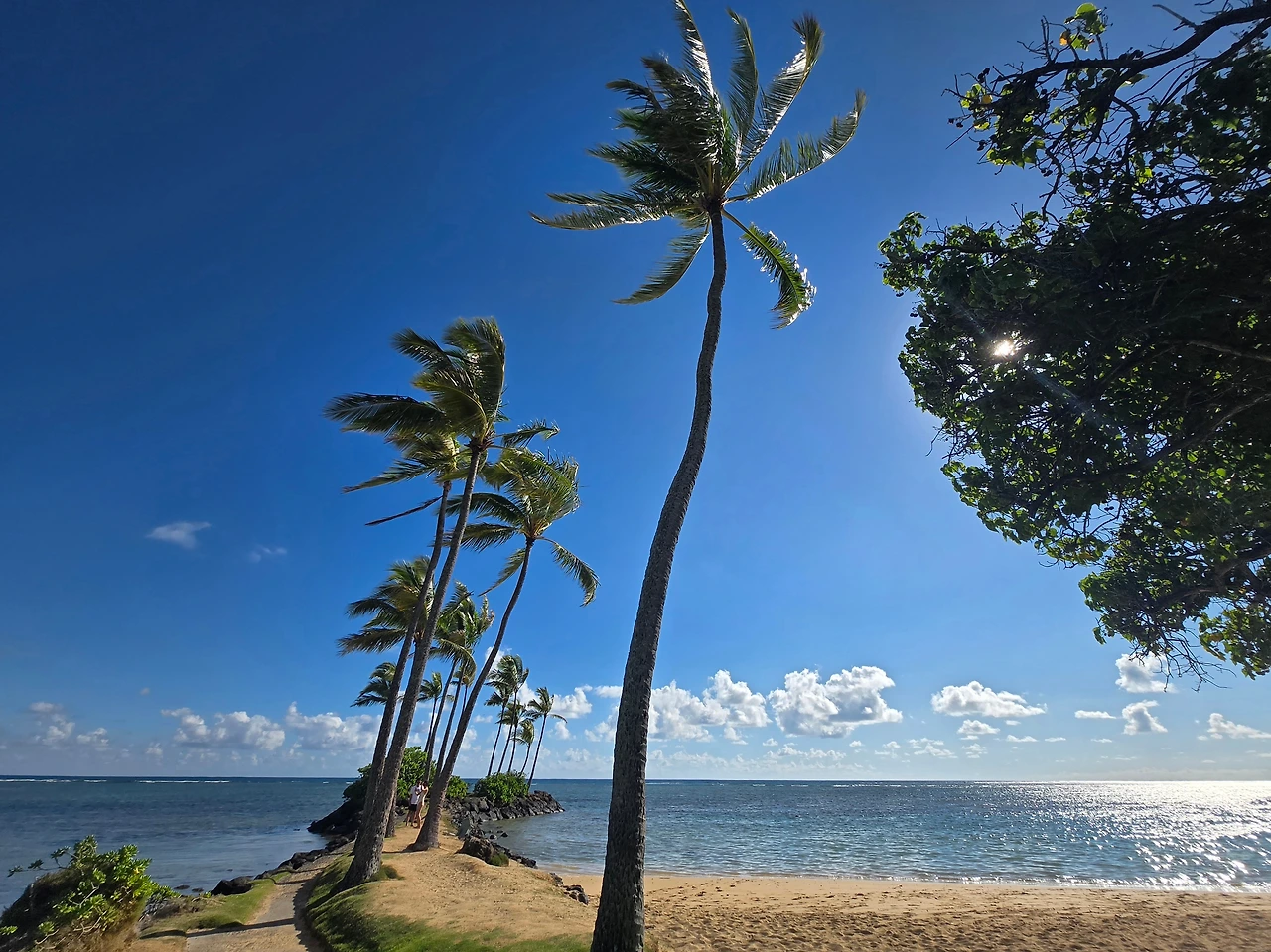 돌고래쇼를 본 후 해변으로 향하니 카알라 비치에 왜 사람이 없었는지 이해가 된다. 여행객들이 카할라 호텔에 있는 해변에 모여 죽 늘어선 파라솔 아래 하얀 의자에 몸을 누워 하와이의 태양을 즐기고 있었던 것이다. 백사장을 따라 걸어가니 약간 튀어나온 섬처럼 조그만 산책길이 있었다. 이곳이 지금까지 하와이에서 본 최고의 경치였던 것 같다. 한편에는 다이아몬드 헤드산이 배경으로 서있고 바다와 구름이 서로 맞닿아 있으며 야자수가 배경에 한 폭의 그림을 그리고 있었다. 거의 모든 커플들이 이곳에서 배경을 사진으로 서로에게 사진을 찍어주고 있다. 나에게 사진 찍어달라고 부탁하는 커플에게도 흔쾌히 Of course를 외치며 그들의 시간을 눌러준다. 엄지 척을 하며 사라지는 그들을 보는 것도 즐거웠다.