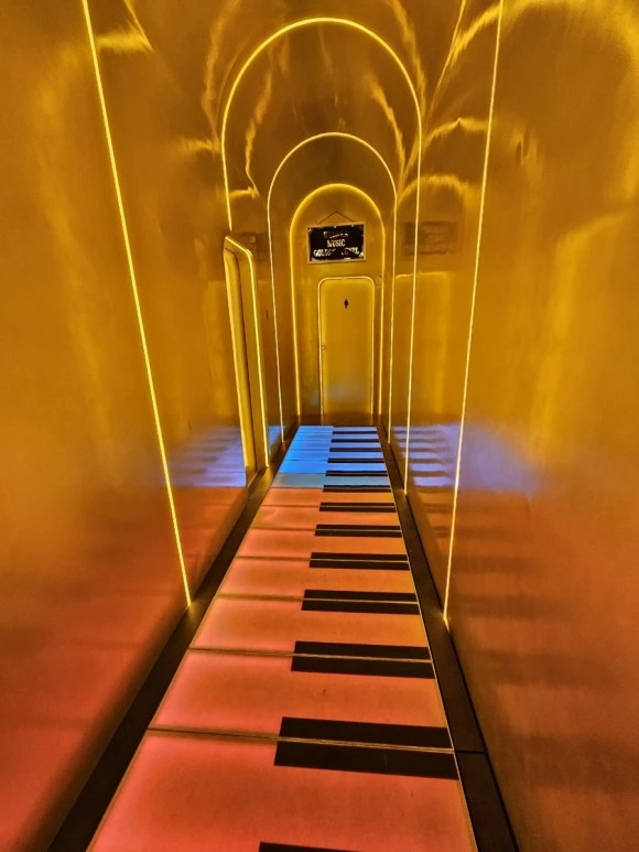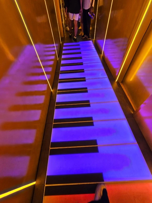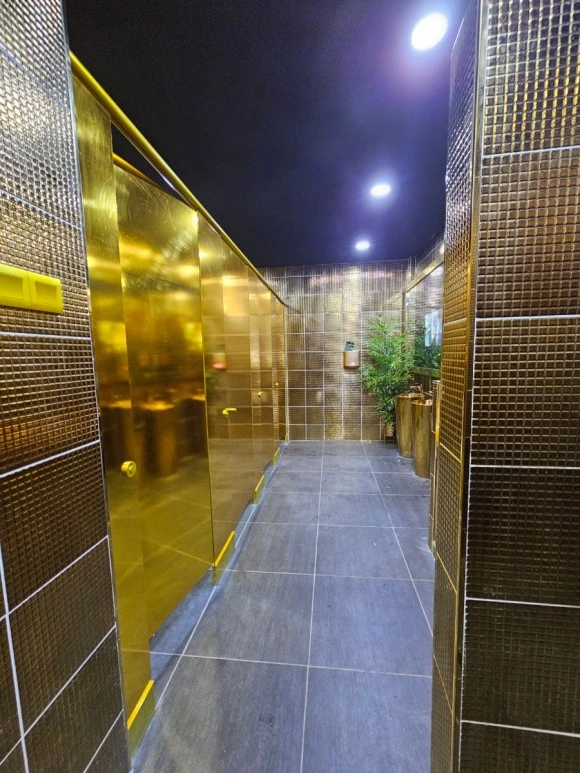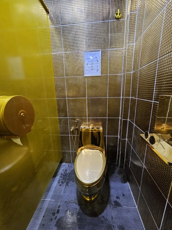 그러나 비가 조금씩 내리고 있어 티켓을 끊지 않고 화장실을 찾으니 황금 화장실이 티켓박스옆에 있었다. 2링깃(600원)을 내고 황금빛 화장실에 발을 내디디니 지금까지 본 화장실입구 중 가장 예쁜 모습이 펼쳐진다. 피아노 건반형태로 들어가는 사람의 발자국에 맞춰 음이 울리며 남 녀 화장실로 들어간다. 한 젊은이가 피아노 위 건반 위를 폴짝폴짝 뛰며 경쾌한 음악소리와 더불어 화장실 안으로 들어간다. 나는 소심한 건반 소리를 내며 여자 화장실 문을 열자 화장실 문을 비롯하여 내부에 변기, 휴지통. 모두 황금색으로 되어있었다. 황금 변기통 정말 우아하게 생겼다. 거기에다 실례를 해도 되나 싶을 정도로 화려한 금색을 뽐내고 있었다. 왕들은 황금 화장실을 쓰나 생각하다, 갑자기 로비에 실제 금으로 장식된 부르나이 7성급 호텔이 생각난다. 세상에 2개 밖에 없다는 7성급 호텔 로비를 장식한 기둥들이 황금띠를 두르며 화려하게 장식되어 있었었다. 브루나이 호텔도 가지지 못한 황금 화장실이 말레이시아에 있다니 흥미로운 경험이었다.