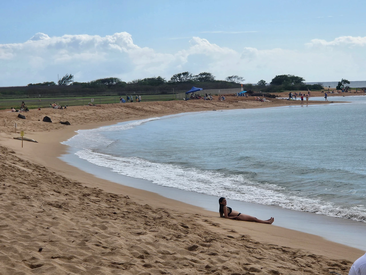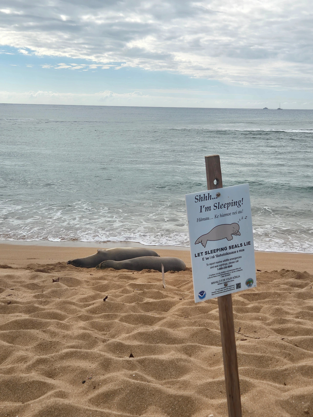 일행들은 투어에서 준비한 닭고기를 맛있게 먹고 바다 물개가 나왔다는 소리에 바닷가로 향한다. 이곳도 두 마리의 하와이 뭉크 물범(Hawaiian monk seal)이 모래사장에 누워 잠들어 있었다. 이 뭉크는 목의 주름이 수도사의 모자주름과 비슷하다고 하여 monk라는 별명을 얻었으며 멸종위기로 하와이에서만 서식한다고 한다. 물개 주변으로 '잠자고 있어요' 푯말이 부착되어 있고 역시 물개를 보호하기 위해 감시원이 가까이 다가가지 못하게 하고 있었다. 자는 모습이 아주 귀여웠고. 한 마리는 배를 내밀고 자는 모습이 개구쟁이 같았다. 이렇게 인간과 동물이 그리고 조류등 서로 조화를 이루어 평화롭게 사는 세상이 얼마나 될까? 서로에 대한 믿음으로 편히 잠든 거북이와 물개 그리고 모래사장과 도로를 무단횡단하며 활개 치는 닭들을 보며 새삼 생명의 존중과 함께 어우러져 살아가야 할 생물들과의 관계를 살펴보게 한다.
