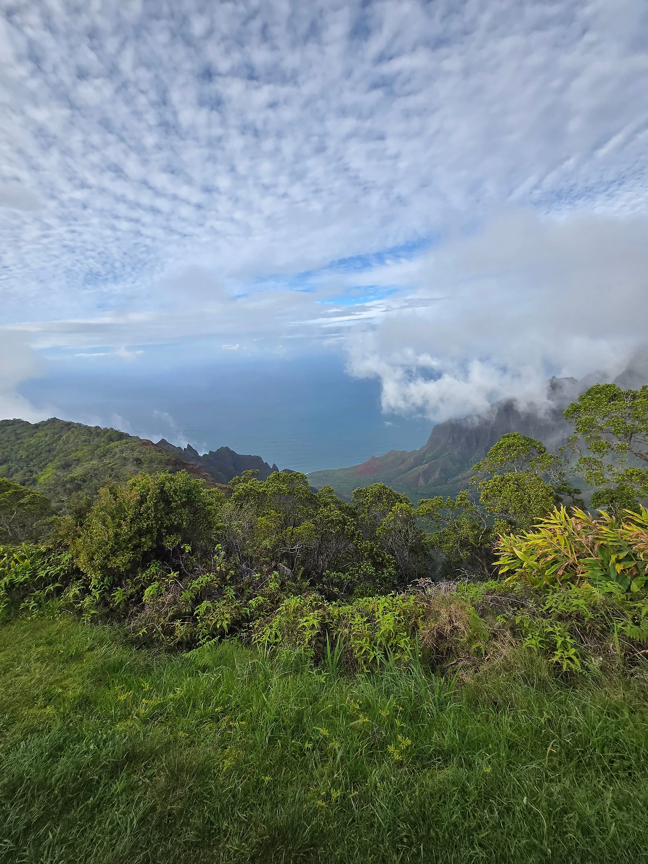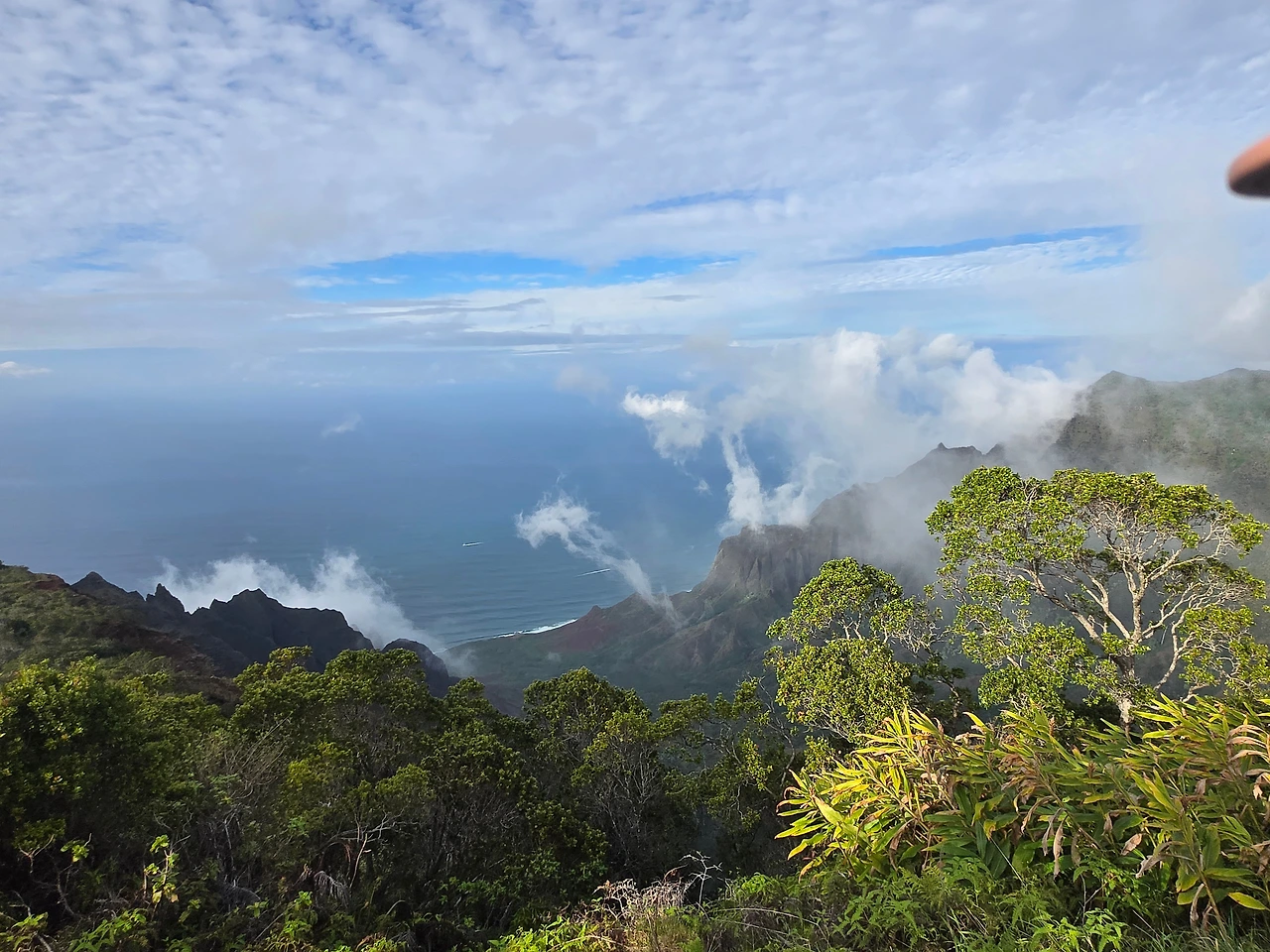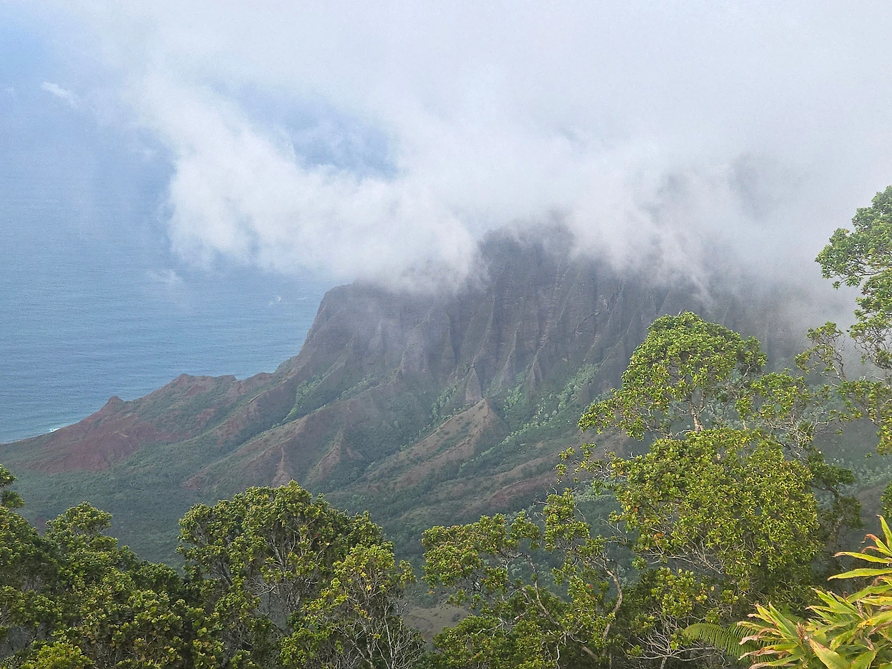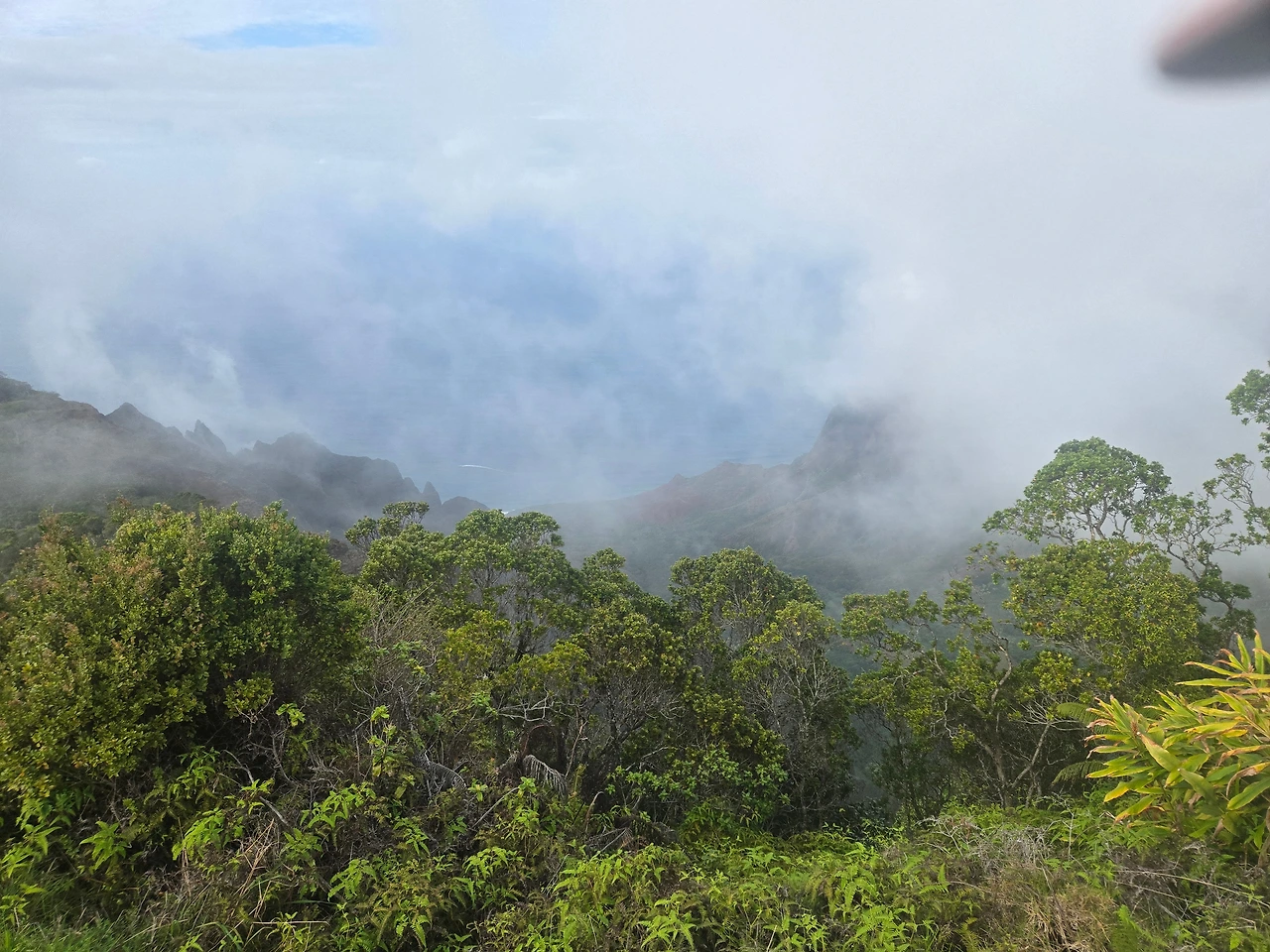 와이메아 캐니언에서 조금만 더 올라가면 '코케에 주립공원(Koke'e State Park)'이 나온다. 협곡을 보았을 때는 다행히 해가 비쳐 붉은색에 비친 아름다운 협곡을 볼 수 있었는데 얼마 지니지 앉아 가이드는 주립공원은 경치를 볼 수 없을 것 같다고 말한다. 협곡이 보이면 공원이 구름에 가려 잘 보이지 않는다는 것이다. 그 말이 현실처럼 주차장에서 내리자 구름에 가려 앞을 볼 수 없는 광경이 펼쳐진다. 불과 몇 분 전에 보았던 풍광은 구름에 묻혀있고 추위도 찾아왔다.