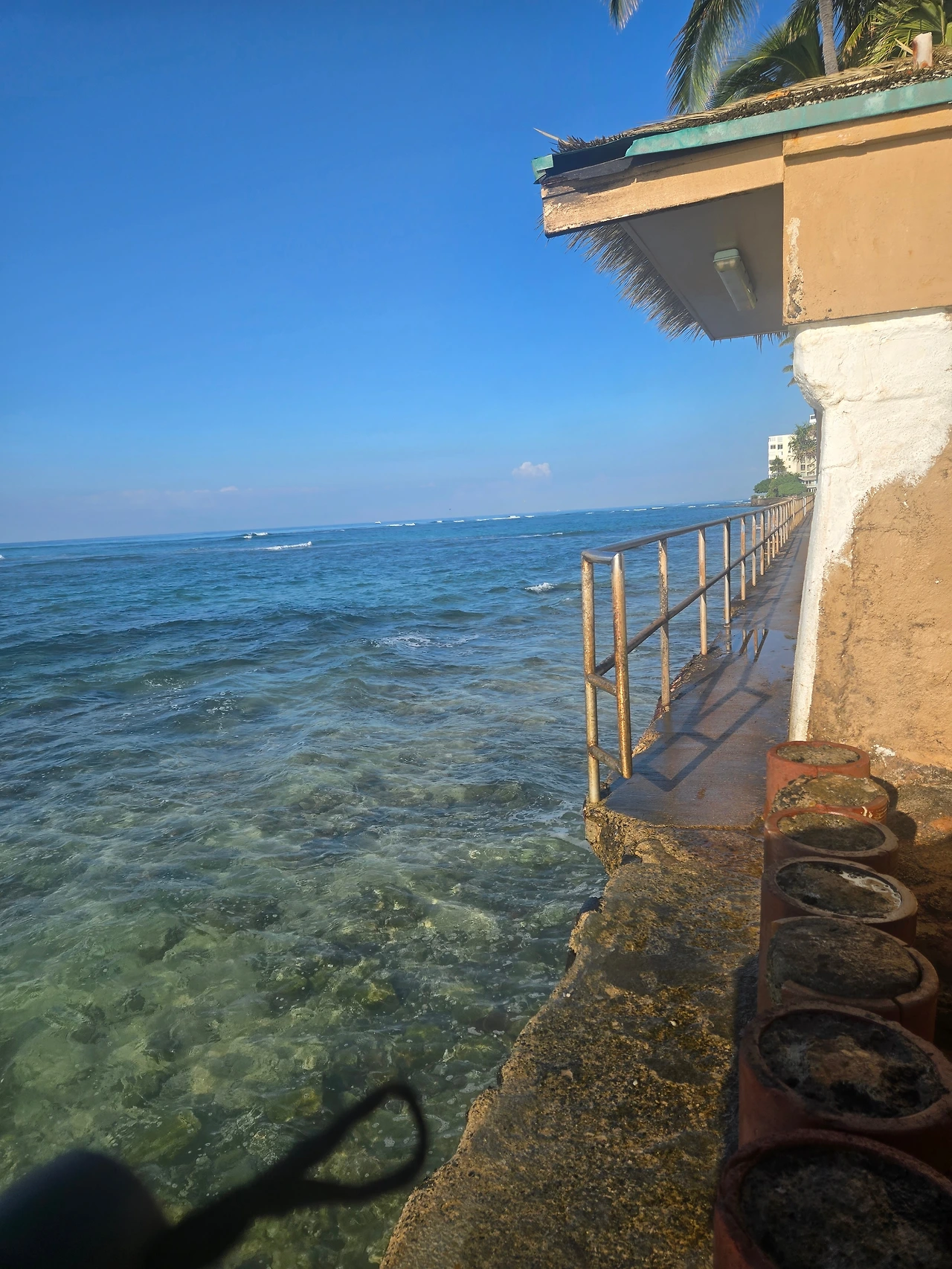 이곳의 특이한 점은 해변가 주택 이었다. 이렇게 바닷가 가까이 주택이 있는 것을 본 적이 없다. 즉 집이 바다에 붙어있다 라는 표현이 맞을 것이다. 벤치에서 일어나 걸어가 보니 집과 담장사이에 작은 통로가 있다. 궁금하여 그 길을 따라 걸으니 사람이 겨우 지나갈만한 통로가 나오며 집이 해안가 바로 옆에 있고 대문도 바다를 향해 열려있었다. 태풍이 불면 이 집들은 어떻게 될까? 바다와 너무 인접해 집을 전부 삼켜버릴 것 같았다. 무슨 비밀이 여기에 있을까 궁금해진다. 나중에 물어보니 이곳은 태풍이 직접 상륙하는 경우가 매우 드물고, 현무암바위와 암반해안으로 파도가 바로 흡수 분산된다고 한다. 이런 구조가 완충지대 역할을 하며 만일을 대비해 1층을 비워두거나 배수로를 많이 설치한다고 한다.