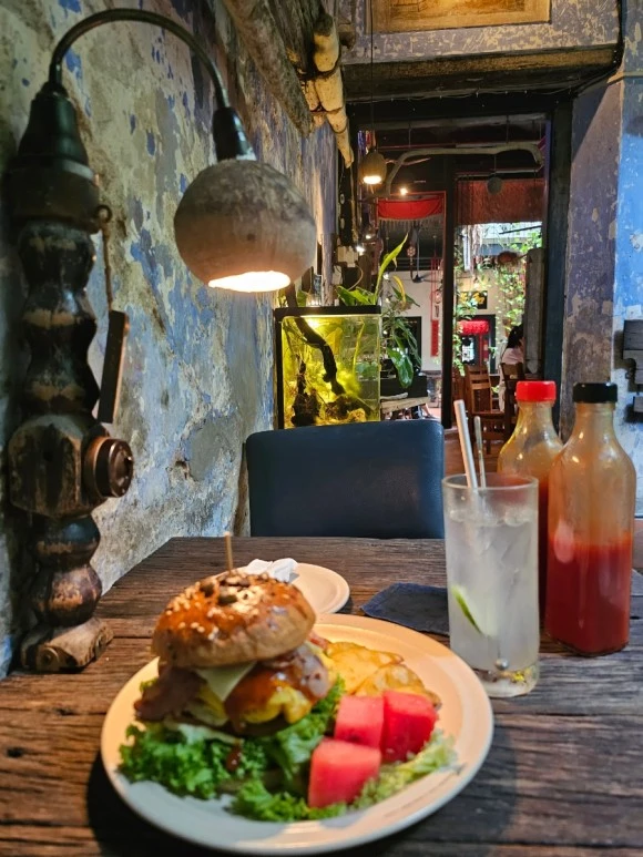 버거는 맛이 있었으며 음료포함 30링깃을 낼만한 가치가 있었다. 2인 식탁도 한쪽 벽면에 배치를 하고 여러 명 일 때는 식물사이에 군데군데 의자를 배치해 놓아서 이곳이 도심의 한 복판이라는 것을 전혀 실감하지 못하게 하였다. 도심의 숲 속이었다. 여행을 다니다 보면 사람들의 다양한 아이디어에 신선한 충격을 받는다. 한국도 요즘 한옥집을 그대로 이용하여 카페로 사용하는 것과 비슷한 것 같다.