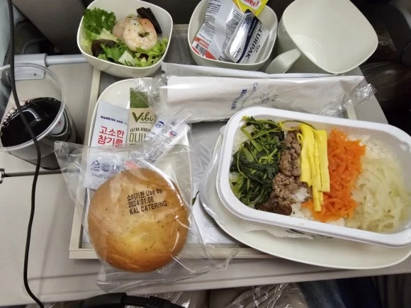 6시간 20분 걸린다는 기장의 기내 방송을 듣고 헐리우드 액션물 두 편의 영화를 보았다. 시간 메꾸기에 영화는 지루함을 달래주는 선물이다. 보는 중간에 기내식이 왔다. 서비스가 좋아 와인과 비빔밥을 시키고 후식으로 아이스크림도 먹었다. 좀 시간이 지나니 비빔 김밥과 음료도 제공된다.